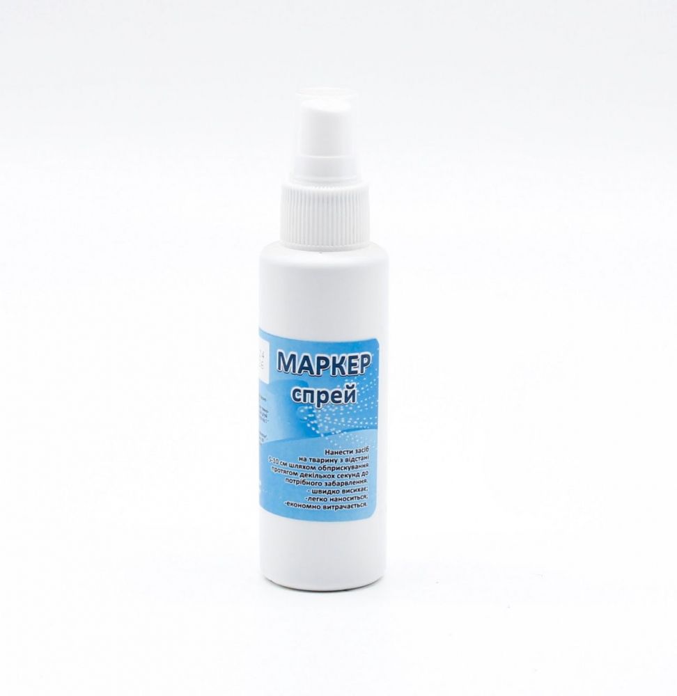 Маркер Спрей(засіб для короткочасного маркування тварин )рекомендації щодо застосуванняОпис.Рідина синього або фіолетового кольору.СкладМетиленовий фіолетовий, розчинник.ЗастосуванняДля короткочасного маркування тварин.Спосіб застосуванняНанести засіб на тварину з відстані 5-10 см шляхом обприскування протягом декількох секунд до потрібного забарвлення.Форма випускуПолімерні флакони з дозаторами по 100 мл.ЗберiганняВ сухому темному, недоступному для дітей місці при температурі від 5до 25С.Термін придатності2 рокиВиробник:ПП фірма Фарматон, вул. Дворецька, 89, м.Рівне, Україна.