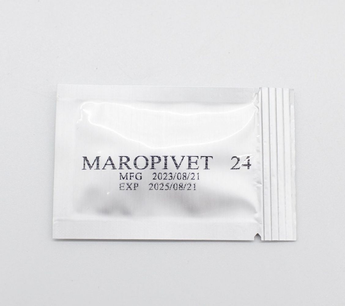 Загальні відомостіТоргове найменування лікарського препарату: МаропиветМіжнародне непатентоване найменування:маропітантЛікарська форма:таблетки для перорального застосування.ТаблеткаМаропівет містить як діючу речовину маропітант - 24 мг (Маропивет пакують по 4 таблетки в алюмінієві блістери, які пакують у картонні коробки.Термін придатностілікарського засобу при дотриманні умов зберігання становить 3 роки з дати виробництва.Термін використання таблетки після вилучення з блістера становить 2 доби.Забороняється застосовувати лікарський препарат після закінчення терміну придатності.Зберігають лікарський препарат у закритій упаковці виробника, у сухому, захищеному від світла місці, окремо від продуктів харчування та кормів при температурі від 0С до 30С.Лікарський препарат слід зберігати у місцях, недоступних для дітей.Невикористаний лікарський препарат із терміном придатності, що минув, утилізують відповідно до вимог законодавства.Маропітанта цитрат - діюча речовинаМаропивета - відноситься до групи протиблювотних засобів, є антагоністом нейрокінінових рецепторів (NK1) та інгібує звязування субстанції Р, нейропептиду тахікінінової групи в ЦНС.Маропітанта цитрат ефективний при блюванні як центрального, так і периферичного генезу.Прийом їжі не впливає на біодоступність препарату.Маропивету таблеткахзастосовують виключно собакам для запобігання блюванню різного генезу.Препарат не рекомендується застосовувати вагітним та лактуючим тваринам, тваринам до 16-тижневого віку, а також тваринам з підвищеною індивідуальною чутливістю до компонентів препарату.ДозуванняМаропівет у таблетках застосовують перорально в наступних дозах:Для профілактики блювоти у собак при синдромі заколисування в дозі 8 мгкг маси тварини по діючій речовині за 1-2 години до поїздки призначають одноразово, але при необхідності можливе повторне введення препарату наступного дня (всього не більше двох вступів).Як протиблювотний засіб при інших патологіях таблетки Маропивета призначають у дозі по діючій речовині 2 мгкг маси тварини на добу не більше 5 діб.При введенні препарату в дозі, що перевищує 20 мгкг, можливе надлишкове слиновиділення та діарея.Особливостей дії на початку введення та скасування Маропивета не виявлено.У разі появи алергічних реакцій використання лікарського препарату припиняють та призначають антигістамінні засоби та симптоматичне лікування.Слід уникати перепусток при введенні чергової дози препарату, оскільки це може призвести до зниження ефективності.У разі пропуску однієї дози слід відновити курс лікування у передбачених інструкцією дозах та схемі застосування.При застосуванні таблеток Маропивета відповідно до інструкції побічних явищ та ускладнень, як правило, не наголошується.Лікарський препарат можна призначати одночасно з нестероїдними протизапальними засобами, антибіотиками, протипаразитарними препаратами.При призначенні препарату одночасно з цими лікарськими засобами побічні ефекти не відмічені.Лікарський препарат не призначений для застосування продуктивним тваринам.При роботі з препаратом Маропивета слід дотримуватись загальних правил особистої гігієни та техніки безпеки, передбачених при роботі з лікарськими препаратами.Після роботи руки слід вимити теплою водою з милом.При випадко