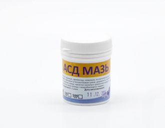 СкладАСД 3 фракція, димексид, новокаін, 1,2 пропандіол, поліетиленоксид.ОписАСД-3Ф стимулює ретикулоендотеліальну функції, нормалізуєживлення і покращує загоєння тканин, має виражений антисептичний ефект.Спосіб застосування та дозиПризначається тварині в вигляді мазевих повязок в разі:інфікованої рани, що мляво загоюється,екземі,дерматиті,хронічному запальному ураженні шкіри,трофічній виразці,свищах,копитній гнилі овець,некробактеріозі тварини.Лікування проводиться до повного зникнення симптомів, міняючи серветки з маззю кожен день. У разі екземи, пролежня, дерматиту, хронічного запального ураження шкіри, піодермії і трофічних виразок на пошкоджену ділянку шкіри наноситься препарат 1 раз в день, поширюючи мазь на 2-3 см вище ураженої шкіри для запобігання розростання запального процесу.Лікування проводиться до повного зникнення симптомів хвороби. У разі великогоураження мазь наноситься поперемінно на різних ділянках, змащуючи за один заз не більше ніж 10-ої частини шкіри тварини. У разі некробактеріозу тваринного і копитної гнилі овець після попередньої обробки уражену ділянку змащують маззю 1 раз в день до повного зникнення симптомів хвороби.ПротипоказанняНе встановлені.Побічна діяНе спостерігаються.Умови зберіганняЗберігається в сухому, темному місці.Термін придатностіТермін придатності - 2 роки.