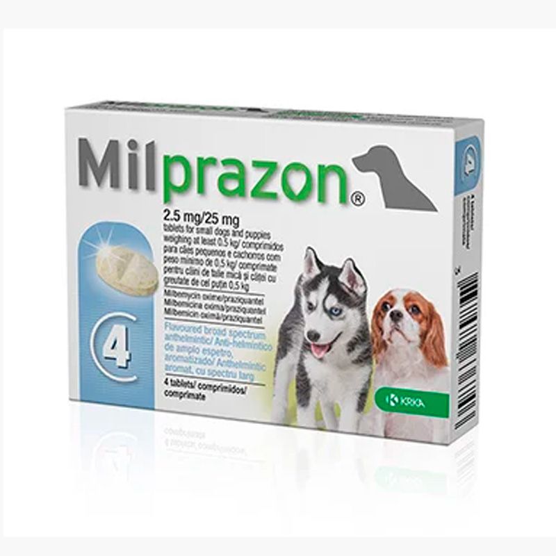 ОписМілпразон - комбінований антигельмінтний препарат нематоцидна і цестоцидна дії. Діючі речовини, що входять до складу препарату, обумовлюють його широкий спектр антигельмінтної дії.Таблетки для собак в модифікації для цуценят і маленьких собак вагою до 5 кг представляють собою овальні, двоопуклі таблетки зі смаком мяса жовтувато-білого кольору з коричневими вкрапленнями та рискою на одному боці. Розфасований по 2 або 4 таблетки в блістери з фольги, упаковані в картонні коробки в комплекті з інструкцією із застосування.СкладОдна таблетка містить діючі речовини:Мілбеміцина оксим - 2,5 мгПразиквантел - 25 мг.Допоміжні компоненти: мікрокристалічна целюлоза, натрію кроскармелоза, повідон, лактоза моногідрат, кремній колоїдний і магнію стеарат, ароматизатор мяса, порошок дріжджівВсі таблетки Мілпразон мають привабливий для тварин смак мяса.Фармакологічні властивостіМілпразон таблетки для собак відносяться до групи комбінованих антигельмінтних лікарських препаратів нематодоцидної і цестодоцидної дії.Активні компоненти, що входять до складу препарату,забезпечують його широкий спектр антигельмінтної дії.Мільбеміцина оксим - макроциклічний лактон, що отримується в результаті ферментативної діяльності Streptomyces hygroscopicus var. Aureolacrimosus, активний відносно личинок і імаго нематод, паразитуючих в шлунково-кишковому тракті собак, а також личинок Dirofilaria immitis.Механізм дії мільбеміцина обумовлений підвищенням проникності клітинних мембран для іонів хлору (Cl-), що призводить до надмірної поляризації мембран клітин нервової і мязової тканини, паралічу і загибелі паразита. Максимальна концентрація мільбеміцина оксима в плазмі крові собак досягається протягом 2-4 годин, біодоступність становить близько 80. З організму зєднання виводиться в основному в незміненому вигляді.Празиквантел є ацілированим похідним піразинізохіноліна, володіє вираженою дією проти цестод і нематод. Підвищуючи проникність клітинних мембран паразита для іонів кальцію (Ca2 +), викликає деполяризацію мембран, скорочення мускулатури і руйнування тегумента, що призводить до загибелі паразита і сприяє його виведенню з організму тварини. Максимальна концентрація празиквантель в плазмі крові собак досягається через 1-4 години. Зєднання піддається швидкої і практично повної біотрансформації в печінці. Рівень звязування в плазмі становить близько 80, виводиться з організму протягом 2 діб в основному з сечею.Мілпразон таблетки для собак за ступенем впливу на організм відносяться до речовин малонебезпечних (4 клас небезпеки по ГОСТ 12.1.007-76), в рекомендованих дозах не надають сенсибілізуючої, ембріотоксичної і тератогенної дії, добре переносяться собаками різних порід і віку. Препарат токсичний для бджіл, а також риб і інших гідробіонтів.Рекомендації щодо застосуванняТаблетки для собак призначають з лікувальною і профілактичною метою при нематодозах, цестодозах і асоціативних нематод-цестодозних інвазіях, викликаних гельмінтами наступних видів: цестоди - Dipylidium caninum, Taenia spp., Echinococcus spp., Mesocestoides spp . нематоди - Ancylostoma caninum, Toxocara canis, Toxascaris leonina, Trichuris vulpis, Thelazia callipaeda Angiostrongylus vasorum (знижує інтенсивність зараження), Crenosoma vulpis (знижує інтенсивність зараження), Dirofilaria immitis (профілактика захворювання).Спосіб застосування та дозиМілпразон таблетки для собак застосовують одноразово п