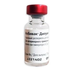 Нобівак ДілуентРозчинник ліофілізованих вакцин Nobivac, що застосовуються інєкційно для імунізації дрібних домашніх тварин.СкладВ 1 см3розчинника міститься:калію дигідрофосфату 0,21 мгдинатрію фосфату дигідрат 0,31 мгводи для інєкцій до 999,16 мг.рН препарату (6,9-7,6).Фармацевтична формаРідина.Вид тваринСобаки, коти, кролі.Показання до застосуванняПрепарат застосовується для розчинення ліофілізованих компонентів вакцин перед проведенням вакцинації дрібних домашніх тварин інєкційним методом.ПротипоказанняНемає.Застереження при застосуванніПрепарат не застосовують в разі порушення цілісності закупорки флаконів, наявності механічних домішок і змін кольору.Взаємодія з іншими засобамиВідсутня.Особливі вказівки при вагітності та лактаціїЗалежить від особливостей застосування вакцин, які підлягатимуть розчиненню препаратом НобівакДілуент.Спосіб застосування та дозиВикористовують відповідно до дозування та способу застосування ліофілізованих вакцин, які підлягатимуть розчиненню препаратом НобівакДілуент. Розчинену вакцину вводять у відповідній дозі підшкірно у ділянці холки.Період виведення (каренції)Нуль діб.Спеціальні застереження для осіб і обслуговуючого персоналу, котрі застосовують препаратЗастосування розчинника проводять з дотриманням загальноприйнятих правил асептики і антисептики. При випадковій інєкції розчиненої препаратом НобівакДілуент вакцини людині, необхідно звернутися до лікаря, передавши йому упаковку або листівку-вкладку вакцинного препарату.Особливі заходи безпеки при поводженні з невикористаним засобомНевикористаний і протермінований препарат, упаковку слід утилізувати відповідно до діючого законодавства України (кипятять або спалюють).Термін придатності60 місяців.Умови зберігання і транспортуванняЗберігати в сухому, темному місці при кімнатній температурі (від 2С до 25С). Не заморожувати.