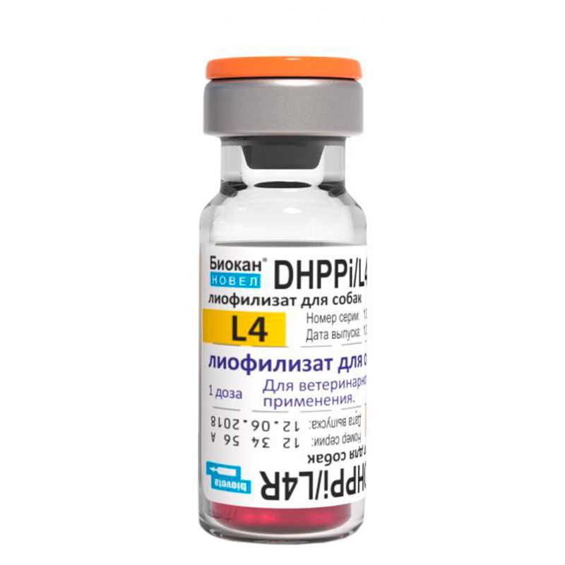 Биокан Новел DHPPiL4R, порошок та розчинник для інєкційної суспензії для собак. Вакцина проти чуми, паровиврусного гастроентерита, інфекційного ларинготрахеїту, інфекційного гепатиту, параинфлеунза 3, чотирьом сіроваром Leptospira і сказуПоказання до застосуванняАктивна імунізація собак з 6-тижневого віку.для запобігання смертності і клінічних симптомів, спричинених вірусом собачої чумидля запобігання смертності і клінічних симптомів, спричинених аденовірус типу 1 у собакдля запобігання клінічних симптомів і зниження виділення аденовірусу типу 2 у зовнішнє середовищедля запобігання клінічних симптомів, лейкопенії та виділення парвовируса собак у зовнішнє середовищедля запобігання клінічних симптомів (виділень з носа та очей) і зменшення виділення вірусу парагрипу (параинфлюенци) собак у зовнішнє середовище Тривалість імунітетуКак минимум, три года после завершения схеми первичной вакцинации сохраняется иммунитет к вирусу собачьей чуми, аденовирусу 1, аденовирусу 2 и парвовирусу собак. Как минимум в течение одного года после завершения схеми первичной вакцинации сохраняется иммунитет к вирусу парагриппа (параинфлюенци) собак.Продолжительность иммунитета к аденовирусу 2 (CAV-2) не определена провокационним тестом. Било подтверждено наличие антител к CAV-2 в течение 3 лет после вакцинации.Принято считать, что иммунитет к респираторним заболеваниям, визванним CAV-2, сохраняется, как минимум, в течение 3 лет.Спосіб введення препаратуПідшкірне введення.Дозування і спосіб введенняЛіофілізат розчиняється у розчиннику в асептичних умовах. Добре збовтайте, і відразу ж введіть весь обєм розведеного препарату (1 мл).Розведена вакцинаПрозора білувата або жовтувата рідина з легкою опалесценцією.Схема первинної вакцинаціїДві дози препарату Биокан Новел DHPPi з перервою в 3-4 тижні, починаючи з 6-тижневого віку.Якщо необхідний захист від лептоспірозу, в якості другої дози можна використовувати сумісний продукт Биокан Новел DHPPiL4 згідно зі спеціально розробленою схемою вакцинації (на підставі зведеної характеристики препарату Биокан Новел DHPPiL4).Схема повторної вакцинаціїОдна доза препарату Биокан Новел DHPPi вводиться один раз на три роки. Для захисту від вірусу парагрипу (параинфлюенци) необхідна щорічна ревакцинація, тому кожен рік можна вводити одну дозу вакцини Биокан Новел DHPPi або Биокан Новел PiL4 за необхідності. Повноцінний імунітет до компоненту лептоспіри в складі вакцини PiL4, використовуваної для щорічної ревакцинації, виробляється тільки після завершення схеми первинної вакцинації вакциною Биокан Новел, до складу якої входить компонент L4.Вигляд тваринСобаки