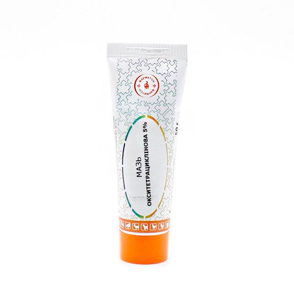 Мазь від світло-жовтого до жовто-коричневого кольору.Склад:1 г препарату містить діючу речовину:окситетрациклін гідрохлорид - 50 мг. Допоміжні речовини: антрацин-55, ланолін, вазелін.Фармакологічні властивості:Мазь володіє вираженими бактеріостатичними властивостями, які обумовлені дією окситетрацикліну антибіотика широкого спектра протимікробної дії, активний відносно більшості грампозитивних і грамнегативних бактерій (Staphylococcus spp., Streptococcus spp., Pasteurella spp., Salmonella spp. тощо), а також рикетсій (Rickettsia spp.) деяких видів хламідій (Chlamydia spp.) і мікоплазм (Mycoplasma spp.), неактивний відносно Pseudomonas auruginosa.Застосування:Лікування великої рогатої худоби, коней, овець, кіз, свиней, собак, котів і кролів при опіках, обмороженнях і ранах різного походження, при захворюваннях шкіри (дерматит, екзема та інші), викликаних мікроорганізмами, чутливими до окситетрацикліну.Дозування:Мазь наносять зовнішньо рівномірним тонким шаром на уражені ділянки шкіри або рану і на 2-4 см навколо них 1-2 рази на добу до зникнення ознак захворювання. Перед нанесенням мазі уражену ділянку шкіри ретельно очищають від шерсті, механічних домішок, забруднень, ексудату, некротичного матеріалу. Для посилення дії препарату зверху рекомендується накладати звичайну повязку, можна з пергаментним папером, яку міняють 1 раз на добу.Протипоказання:Підвищена чутливість до окситетрацикліну.Застереження:Немає.Форма випуску:Пластикові контейнери або туби по 20, 45, 100, 200 і 300 р. Зберігання:Сухе, темне, недоступне для дітей місце за температури від 5 до 25 С. Термін придатності:2 роки.