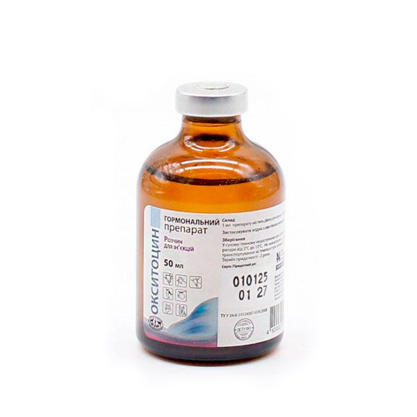 ОписДопомога самкам сільськогосподарських та свійських тварин при слабких сутичках під час пологівзатримки послідупісляпологових маткових кровотечахатонії, гіпотонії та запаленні маткирефлекторної агалактії, а також у комплексному лікуванні тварин, хворих на метрит, мастит, субінволюцію матки.Склад:1 мл препарату містить: окситоцину 10 ОД.Фармакологічні властивості:ATCvet: QH01BB02Препарат підвищує тонус та посилює скорочення гладкої мускулатури матки.Викликає також скорочення міоепітеліальних клітин, які оточують альвеоли молочної залози (полегшує просування молока у великі протоки та молочні синуси), має слабкі вазопресиноподібні, антидіуретичні властивості.Застосування:Допомога самкам сільськогосподарських та свійських тварин при слабких сутичках під час пологівзатримки послідупісляпологових маткових кровотечахатонії, гіпотонії та запаленні маткирефлекторної агалактії, а також у комплексному лікуванні тварин, хворих на метрит, мастит, субінволюцію матки.Дозування:Препарат застосовують внутрішньомязово або підшкірно, одноразово в дозах (на одну тварину):корови, кобили - (30-60) ОДвівцематки, кози (10-15) ОДсвиноматки - (20-30 ОД)суки (5-10 ОД)кішки - (2-3 ОД).При необхідності введення повторюють через 40 хв.Якщо потрібний швидкий ефект, препарат застосовують внутрішньовенно, попередньо розвівши ізотонічним розчином натрію хлориду у співвідношенні 1:10 і знизивши дозу в чотири рази.Побічні ефекти:У рекомендованих дозах побічні ефекти не описані.Протипоказання:Підвищена чутливість до препарату.Окситоцин протипоказаний при пологовому допомозі у випадках: великого або потворного плодапри неправильному положенні та позиції плода.Застереження:Обмеження для використання тваринницької продукції відсутні.Форма випуску:Скляні флакони по 10 мл, 50 мл та 100 мл.Зберігання:Список Б. У сухому, захищеному від світла та недоступному для дітей місці при температурі (2-10)С.Чи не заморожувати.Допускається транспортування за температури не вище 25С до 3 діб.Термін придатності: 2 роки.