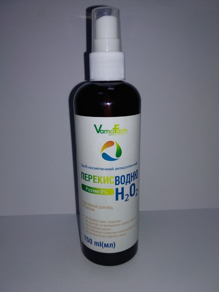Показання до використанняВикористовувати для догляду за проблемною шкірою обличчя при вугровій висипці, як допоміжний до антибактеріального засобу для дезодорації шкіри стоп та видалення неприємного запаху для освітлення волосся, пігментних плям, веснянок, поствугрових рубцевих пігментацій на шкірі обличчя і тіла.Спосіб застосуванняЗасіб цілеспрямовано розпиляти з відстані 10-15 см на поверхню шкіри або на ватний тампон (для обробки шкіри обличчя).Уникати потрапляння в очіПри випадковому попаданні перекису водню в очі, промити їх водою.ЗастереженняМоже викликати знебарвлення волосся та тканин з волокон натурального походження. Не застосовують для чутливої шкіри, області навколо очей та при непереносимості компонентів спреюУмови зберіганняЗберігати в темному, прохолодному, недоступному для дітей місці, захищеному від прямих сонячних променів при температурі від +5 С до +25 С.