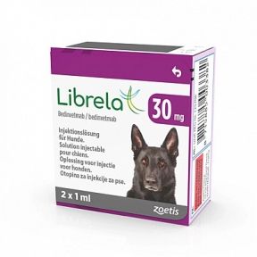 ЛібрелаЯКІСНИЙ І КІЛЬКІЙ СКЛАДКожен флакон обємом 1 мл містить:бідінветмаб:5 мг10 мг15 мг20 мг30 мг собачі моноклональні антитіла, експресовані рекомбінантними методами в яєчнях китайського хомячка.ЛІКОВА ФОРМАРозчин для інєкцій.Від прозорого до злегка опалювального розчину.КЛІНІЧНІ ОСОБЛИВОСТІЦільові типи собаки.Показання для застосування із зазначенням цільових видів для полегшення болю, повязаного з остеоартритом у собак.Протипоказання - не використовуйте при підвищеній чутливості до активної речовини або будь-якої допоміжної речовини.Не застосовувати у собак віком до 12 місяців.Не застосовувати тваринам, призначеним для розведення.Не застосовувати вагітним або тваринам, що годують.Особливі запобіжні заходи при використанні:-Особі, яка вводить ветеринарний лікарський препарат, повинна вживати спеціальні запобіжні заходи.-Реакції гіперчутливості, включаючи анафілаксію, можуть потенційно виникнути у разі випадкової інєкції. Повторне самостійне застосування може збільшити ризик реакцій гіперчутливості.-Важливість фактора росту нервів у забезпеченні нормального розвитку нервової системи плода є дуже високою. -У разі випадкового самостійного уколу негайно зверніться до лікаря та покажіть лист-вкладиш або етикетку.Побічні реакції (частота та серйозний):У поодиноких випадках можуть спостерігатися легкі реакції в місці інєкції (наприклад, набряк та підвищення місцевої температури).Частота побічних реакцій визначається за наступною умовою:- дуже часто (більше 1 з 10 пролікованих тварин проявляються побічні реакції)- звичайні (більше 1, але менше 10 тварин на 100 оброблених тварин) - нечасто (більше1, але менше 10 тварин на 1000 обробленихтварин0 рідко (менше однієї тварини з 10000 оброблених тварин, включаючи поодинокі повідомлення).Використання під час вагітності, годування груддю або яйцеклітини:-не застосовувати вагітним або тваринам, що годують.Взаємодія з іншими лікарськими засобами та інші форми взаємодії:-У лабораторних дослідженнях протягом 2-тижневого періоду у молодих здорових собак без остеоартриту препарат не чинив побічної дії при одночасному застосуванні з нестероїдним протизапальним препаратом (карпрофеном).- Немає даних про безпеку одночасного тривалого застосування нестероїдних протизапальних засобів та біноветмабу у собак.- Жодних взаємодій не спостерігалося у польових дослідженнях, де цей ветеринарний препарат застосовувався одночасно з паразитицидами, протимікробними препаратами, місцевими антисептами, антигістамінними препаратами та вакцинами.Кількість та спосіб введення:-підшкірне використання.Режим дозування та лікування:Рекомендована доза становить 0,5-1,0 мгкг маси тіла один раз на місяць.LIBRELA кількість (мг) для введенняМаса тіла (кг) собаки5101520305.0-10.01 флакон10.1-20.01 флакон20,1-30,01 флакон30,1-40,01 флакон40,1-60,01 флакон60,1-80,02 флакони80,1-100,01 флакон1 флакон100,1-120,002 флакониПередозування (симптоми, дії в екстрених випадках, антидоти за потреби):Жодних побічних реакцій, за винятком легких реакцій у місці інєкції, у лабораторії не спостерігалося.-При появі несприятливих клінічних проявів після передозування необхідно провести симптоматичне лікування собаки.ІМУНОЛОГІЧНІ ВЛАСТИВОСТІ.Фармакотерапевтична група інші анальгетики та жарознижувальні засоби.Механізм діїБідіветмаб є собачим моноклональним ант