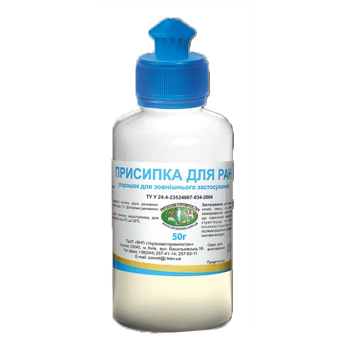 ПРИСИПКА ДЛЯ РАНлистівка-вкладкаОписОднорідний порошок від світло-жовтого до жовтого кольору із специфічним запахом ксероформу.Склад100 г препапрату містить діючі речовини:ксероформ - 5 гстрептоцид - 5 гДопоміжні речовини: тальк, крохмаль.Фармакологічні властивостіATCvetкласифікаційний кодQD06 антибіотики та хіміотерапевтичні препарати для місцевого застосування.QD06BA99 Сульфаніламіди, у комбінаціях.Ксероформ має вяжучі, підсушуючі властивості, звужує судини, зменшує ексудацію, знижує чутливість і послаблює запальні процеси. Сильний антисептик.Стрептоцид відноситься до сульфаніламідних сполук. Він характеризується широким спектром антимікробної дії проти грампозитивних (Streptococcus spp., Clostridium spp., Corynebacterium spp., та інші) і грамнегативних мікроорганізмів (Escherichia coli, Salmonella spp., Klebsiella spp., Proteus spp., Pasteurella spp., Bordetella spp. та інші), але майже неактивний по відношенню до стафілококів. Стрептоцид діє бактеріостатично, перешкоджаючи використанню пара-амінобензойної кислоти мікорорганізмами для синтезу дигідрофолієвої кислоти, яка бере участь у синтезі піримідинових основ ДНК та РНК мікробної клітини.ЗастосуванняЛікування великої рогатої худоби, коней, овець, кіз, свиней, собак та котів при захворюваннях шкіри ( екзема, дерматит, виразка), що спричинені мікроорганізмами, чутливими до стрептоциду та ксероформу. Для обробки післякастраційних ран та профілактики післякастраційних ускладнень.ДозуванняЗовнішньо. При необхідності ушкоджену ділянку шкіри очищують та припудрюють препаратом та 2-3 см навколо неї. Ушкоджені ділянки обробляють 1-2 рази на добу до загоєння.ПротипоказанняПідвищена індивідуальна чутливість до стрептоциду та ксероформу.ЗастереженняНемаєФорма випускуПоліетиленові банки або поліетиленові чи ламіновані пакети по 50 та 500г.ЗберіганняСухе, темне, недоступне для дітей місце, при температурі від 0С до 25С.Термін придатності- 3 роки.