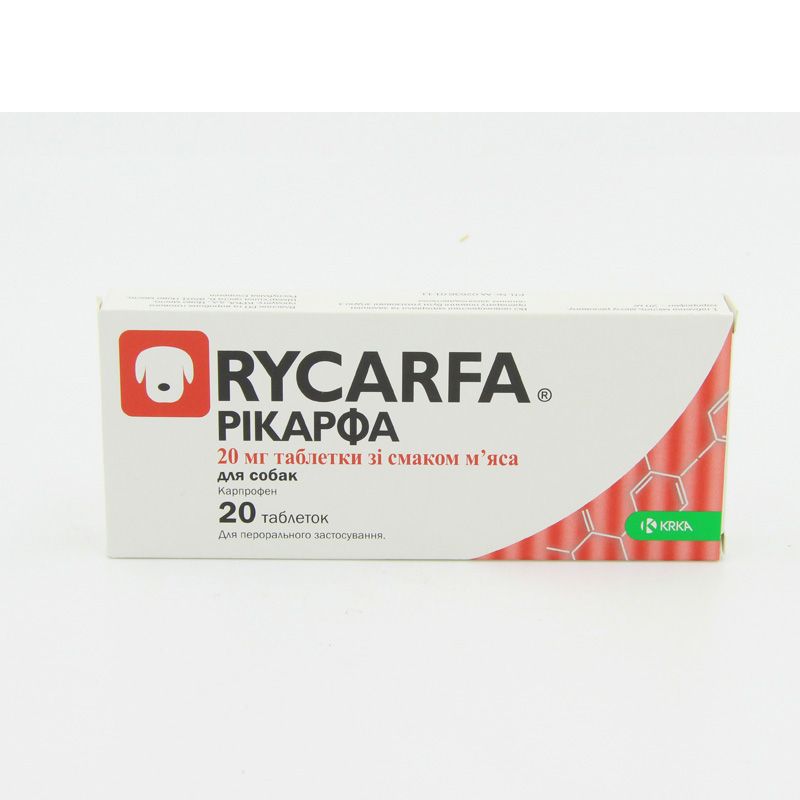 ОписРикарфа протизапальний препарат нестероїдного типу виробництва словенської фірми KRKA. Діюча речовина карпрофен. Його використовують після операцій і при проблемах опорно-рухового апарату. Застосування препарату знімає запальний і больовий синдром і знижує температуру. Лікарський засіб має такі форми:таблетки з дозуванням капрофена в 20, 50, 100 мг для перорального застосування (собак)5 розчин в 20 мл флаконах для внутрішньовенних або підшкірних інєкцій (кішкам і собакам).Інструкція по застосуваннюКурс лікування призначає ветлікар. Інструкція до препарату містить способи застосування для різних ситуацій. При використанні ліки для тварин з проблемами серця, ШЛУНКОВО-кишкового тракту, печінки або нирок необхідно спостереження ветлікаря. Рикарфа сумісний з препаратами, призначеними при анестезії. У разі прояви алергії, прийом припиняють.У рідкісних випадках може виникнути блювота і подразнення слизової шлунка при застосуванні ліків. Карпрофен здебільшого (80) виділяється з організму з фекаліями, тому необхідно стежити за регулярним випорожненням тварини. Препарат протипоказаний вагітним тваринам.Не можна робити внутрішньомязові інєкції розчину. Не слід поєднувати Рикарфа і інші протизапальні засоби. Навіть у разі зміни препарату необхідно витримати 24 години між прийомом рикарфа і препарату на основі іншого діючої речовини. Порушення схеми застосування ліки крім зниження ефективності може викликати побічні ефекти.Препарат відносять до категорії помірно небезпечних речовин, тому Рикарфа можна купити без рецепта у ветеринарних аптеках. Ціна залежить від дозування, обсягу упаковки і способу покупки. Наш інтернет-магазин пропонує кращу ціну на цей препарат і гарантовано захищає своїх покупців від підробок, неякісної та простроченої продукції.Виробник Словенія КРКА