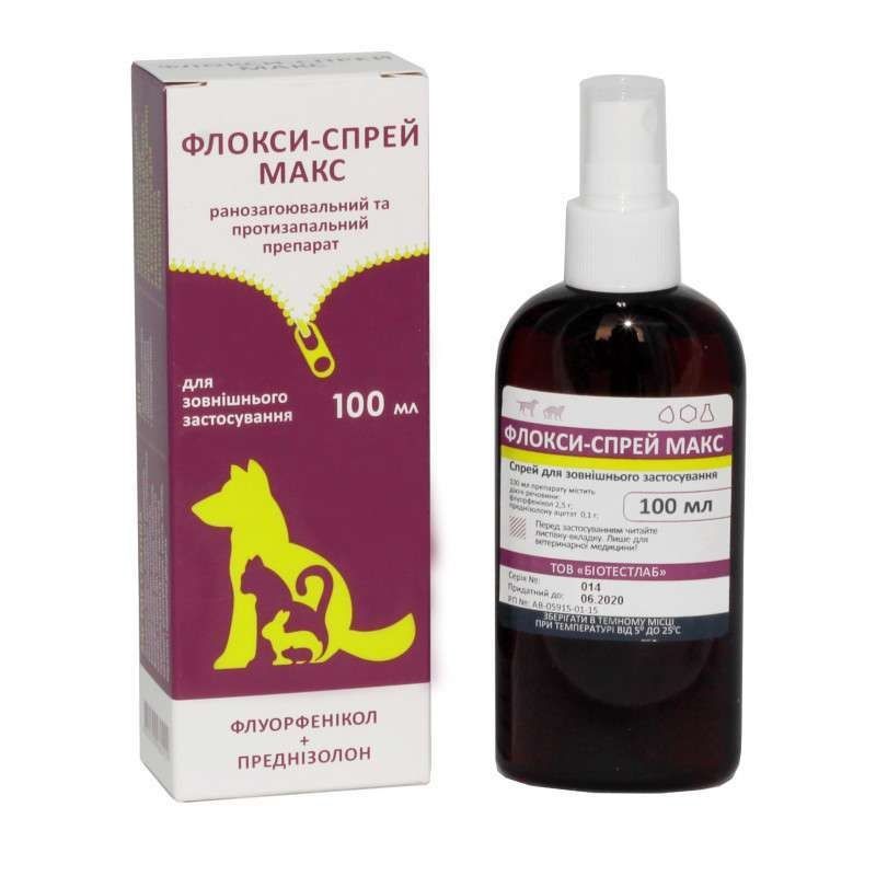 Флоксі спрей Макс є прозорою рідиною безбарвною або світло жовтого кольору. Має протимікробні, протизапальні, протиалергічні та ранозагоювальні властивості. Застосовують для місцевого лікування дерматитів, екзем, панарицій, при укусах, виразках, відкритих абсцесах, а також травматичних та хірургічних ранах (після кастрації).склад:100 мл препарату містить діючі речовини: флуорфенікол 2,5 мг преднізолону ацетат 0,1 г. Допоміжні речовини: метилпіролідон, полівінілпіролідон, спирт етиловий, поліетиленгліколь, гліцерин, диметилсульфоксид.Фармакологічні властивості:АТС vet класифікаційний код QD06 антимікробні ветеринарні препарати для застосування у дерматології. QD07 кортикостероїди для застосування в дерматології.Флоксі-спрей макс - комплексний препарат з протимікробною, протизапальною, протиалергічною та протиексудативною дією, що обумовлено впливом діючих речовин препарату: антибіотика флуорфеніколу та глюкортикоїдів преднізолону.Флуорфеніколє похідним тіамфеніколу, в якому гідроксильна група заміщена атомом фтору, що зумовлює його антибактеріальну активність проти ацетилтрансферазосинтезуючих бактерій, чутливих до хлорамфеніколу. Флуорфенікол діє бактеріостатично на грампозитивні та грамнегативні бактерії, а саме: Fusobacterium necrophorum, Bacteroides melaninogenicus, Streptococcus spp., Staphylococcus spp., Pasteurеlla spp., Salmonella spp., Proteus, Pseudomonas spp., Ricettsia spp., Chlamydia. Флуорфенікол пригнічує синтез білків у клітинах бактерій. У протоплазмі він звязується з 70S-рибосомними субодиницями, пригнічуючи ферментативну активність пептидилтрансфефарази, зменшуючи таким чином синтез білків у рибосомах відповідних бактерій.Преднізолон синтетичний глюкокортикоїд, що діє протизапально, протиалергенно та антиексудативно. Протизапальна дія обумовлена пригніченням метаболізму арахідонової кислоти та вивільненням медіаторів запалення. При місцевому застосуванні відбувається абсорбція преднізолону і активна речовина потрапляє в кровотік. У плазмі 90 преднізолону знаходиться у звязаному вигляді (з транскортином та альбуміном). Біотрансформується шляхом окислення переважно у печінці окислені форми глюкуронізуються чи сульфатуються. Виводиться із сечею та калом у вигляді метаболітів, частково у незміненому вигляді.Диметилсульфоксиду складі допоміжних речовин легко проникає через шкіру і служить переносником для забезпечення шкірної абсорбції діючих речовин препарату. Має місцевоанестезуючу, протизапальну, протимікробну (антисептичну) та фібринолітичну дію. Швидко та добре проникає через біологічні мембрани, в т.ч. через шкіру та слизові оболонки, підвищує їх проникність для інших лікарських засобів. Змінює чутливість мікрофлори, резистентної до антибіотиків.Застосування:Лікування собак, кішок та кроликів декоративних порід, хворих на дерматити, панариції, піодермію, екзему, а також при ранах (у тому числі після кастрації), розчісуваннях, укусах, ударах, виразках, викликаних мікроорганізмами, чутливими до флуорфеніколу.Дозування:Перед нанесенням препарату уражену ділянку ретельно очищають від сторонніх тіл, ексудату, некротизованих тканин. Тримаючи попередньо струснути флакон з препаратом на відстані 5-10 см від поверхні пошкодженої ділянки шкіри тіла, натискають на поршень розпилювача 1-2 рази і обробляють поверхню 5х5 см.Наносити препарат необхідно кожні 12 год