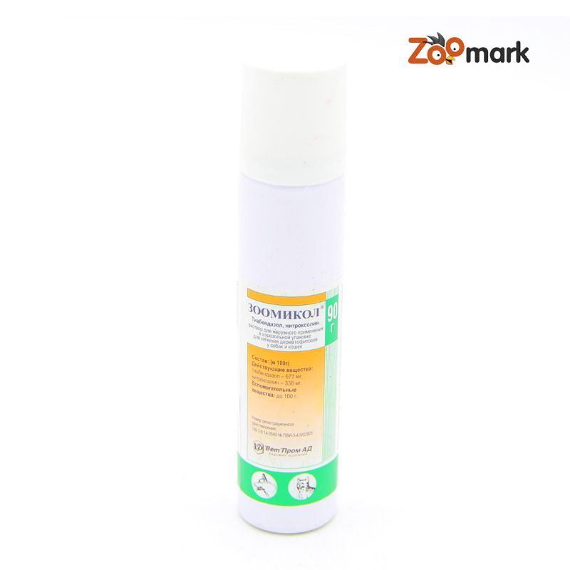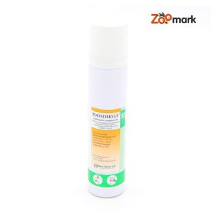 Зоомікол спрей, 90 г БолгаріяСклад та форма випускуЗоомікол як діючі речовини містить тіабендазол - 0,7 і нітроксолін - 0,35, а також допоміжні компоненти. На вигляд є однорідною прозорою рідиною жовто-коричневого кольору. Розфасовують по 90 г металеві флакони з розпилювачем, закупорені полімерними кришками.Фармакологічні властивостіЗоомікол має широкий спектр фунгіцидної активності на збудників трихофітії та мікроспорії свійських тварин. Препарат має антимікотичну дію щодо представників пологів Trichophyton, Microsporum, Epidermophyton, Achorion, Candida та інших збудників шкірних мікозів. Висока ефективність препарату обумовлена наявністю в його складі тіабендазолу, який має здатність інгібувати процеси репродукції патогенних грибів шляхом порушення поділу ядер клітин та нітроксоліну, який вибірково блокує синтез ДНК паразиту. Комбінація діючих речовин з різних фармакологічних груп в одному препараті дозволяє з позитивним ефектом використовувати його на будь-якій стадії захворювання, скоротити термін лікування, знизити ризики можливої резистентності до препарату. Зоомікол за ступенем впливу на організм теплокровних тварин відноситься до малонебезпечних речовин і в рекомендованих дозах не має місцевоподразнюючої, резорбтивно-токсичної та сенсибілізуючої дії.ПоказанняПризначають для лікування шкірних грибкових захворювань сільськогосподарських та дрібних свійських тварин, а також птахів.Дози та спосіб застосуванняПрепарат розпорошують рівномірно на уражені ділянки шкіри у напрямку від периферії до центру із захопленням прикордонної здорової шкіри до 1 2 см. Кратність нанесення препарату визначається ступенем та характером перебігу захворювання та становить: 1 обробка разів на 3 5 днів до зникнення клінічних ознак. У середньому потрібно 3 4 таких обробки.Побічні діїУ дуже поодиноких випадках при підвищеній індивідуальній чутливості до препарату можуть зявитися ознаки подразнення шкіри.ПротипоказанняІндивідуальна чутливість до компонентів препарату.Особливі вказівкиПри проведенні маніпуляцій із препаратом слід користуватися гумовими рукавичками, особливо у разі наявності на руках саден та інших ушкоджень шкіри. Проводити обробку слід у приміщеннях, що добре провітрюються, або на відкритому повітрі, під час неї забороняється пити, палити і приймати їжу. Препарат слід розпорошувати лише на 30 шкірного покриву тварини. При випадковому попаданні засобу на шкіру або слизові оболонки його необхідно змити струменем води або зняти тампоном і потім відмити водою. Після закінчення обробки руки слід ретельно вимити теплою водою із милом.Умови зберіганняУ сухому, захищеному від прямих сонячних променів та відкритого вогню, у недоступному для дітей та тварин місці, окремо від харчових продуктів та кормів при температурі від 5 до 25 С. Флакони з препаратом слід берегти від ударів.Термін придатності 3 роки.