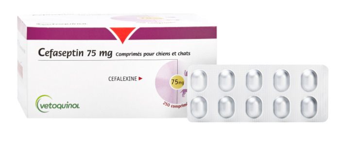Опис:Довгасті таблетки бежевого кольору з поділковими борозенками, що дозволяють розділяти на частини.Склад (діюча речовина):Цефалексин (у формі цефалексину моногідрату) 75 мг, 300 мг або 750 мг залежно від дозування.Допоміжні речовини: моногідрат лактози, кросповідон, повідон К30, натрію кроскармелоза, мікрокристалічна целюлоза, ароматизатори (печінка, дріжджі), натрію стеарилфумарат.Фармакологічні властивості:Антибактеріальний препарат групи цефалоспоринів І покоління (ATCvet QJ01DB01). Має бактерицидну дію, порушуючи синтез клітинної стінки бактерій. Ефективний проти широкого спектра грампозитивних (Staphylococcus spp., Streptococcus spp.) та грамнегативних (Escherichia coli, Proteus mirabilis, Klebsiella pneumoniae, Pasteurella multocida) аеробних бактерій.Показання:Собаки: лікування бактеріальних інфекцій шкіри (поверхнева та глибока піодермія).Собаки: лікування інфекцій сечовивідних шляхів (цистит, нефрит), спричинених чутливими до цефалексину мікроорганізмами.Дозування:Перорально 15 мг цефалексинукг маси тіла двічі на день (еквівалент 30 мгкгдобу).Тривалість лікування:інфекції сечовивідних шляхів 14 днівповерхнева піодермія не менше 15 днівглибока піодермія не менше 28 днів.При тяжкому перебігу доза може бути подвоєна (за виключенням ниркової недостатності).Протипоказання:Підвищена чутливість до цефалексину, інших цефалоспоринів чи -лактамів.Відомі випадки резистентності.Не застосовувати кроликам, морським свинкам, хомякам, піщанкам.Побічна дія:Можливі короткочасні блювання чи діарея. У рідкісних випадках реакції гіперчутливості. При їх появі лікування припиняють.Форма випуску:Цефасептин 75 мг, таблетки 10.Цефасептин 300 мг, таблетки 10.Цефасептин 750 мг, таблетки 6.Зберігання:У сухому, захищеному від світла місці при температурі 525 C. Зберігати окремо від кормів та харчових продуктів.Термін придатності 3 роки.