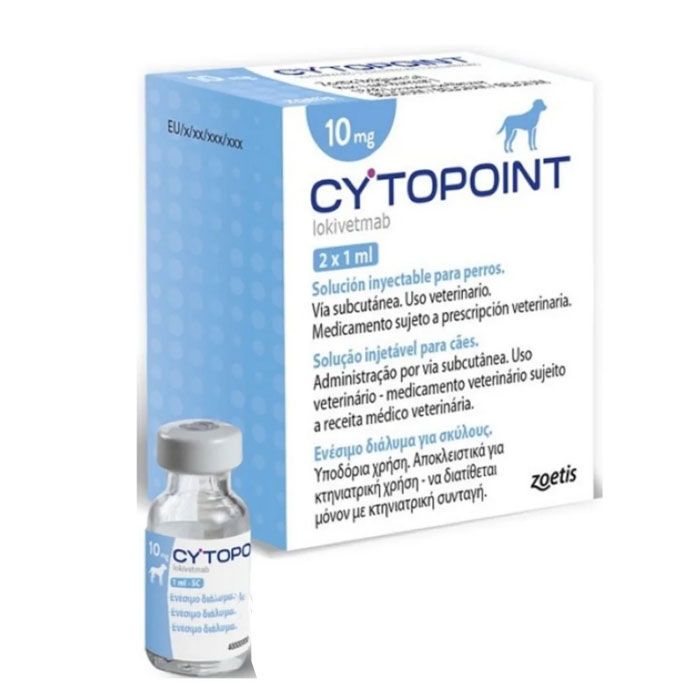 Цитопоінт допомагає зменшити клінічні симптоми, повязані з атопічним дерматитом у собак.Це готова до вживання стерильна рідина, що містить канінізовані моноклональні антитіла (mAb) проти інтерлейкіну-31 (IL-31).Лабораторні дослідження показали, що IL-31 викликає свербіж у собак.Цитопоінт залишається в обігу протягом кількох тижнів.Він має терапевтичний ефект, звязуючись з розчинним IL-31 і нейтралізуючи його, тим самим пригнічуючи свербіж та зменшуючи пошкодження шкіри.Як і інші антитіла, що зустрічаються в природі, і комплекси антитіло-антиген, виведення відбувається через нормальні шляхи деградації білка.БЕЗПЕКАПольове дослідження безпеки показало, що Цитопоінт добре переноситься собаками після підшкірної інєкції.Небажані явища виникали з однаковою частотою у групах лікування та плацебо у дослідженні 245 собак, що надійшли до ветеринарних лікарень з діагнозом атопічний дерматит.У цьому дослідженні собакам вводили Цитопоінт (1,03,3 мгкг маси тіла) або плацебо підшкірно у дні 0 та 28. Ознаки дискомфорту пацієнта при введенні та побічні ефекти виникали з однаковою частотою між групами лікування.Крім того, не було клінічно значимих відмінностей у змінах клінічної патології між групами після прийому будь-якої дози.Було безпечно використано велику кількість супутніх ліків, включаючи паразитициди, антибіотики, протигрибкові препарати, кортикостероїди, вакцини, імунотерапію,Цитопоінт також продемонструвала хорошу переносимість собаками у лабораторному дослідженні безпеки, в якому 7 послідовних щомісячних підшкірних інєкцій вводилися у дозах 3,3 мгкг або 10 мгкг ваги тіла (12 собак у групі).ЕфективністьЦитопоінт демонструє початок ефективності протягом 1 дня та зберігає ефективність протягом як мінімум 1 місяця після одноразової дози у польовому дослідженні.У дослідженні 211 собак, що надійшли до ветеринарних лікарень з діагнозом атопічний дерматит, підшкірно вводили одноразову дозу цитопоінту (до 2,0 мгкг) або плацебо.Дослідження підтвердило значне (P0,05) збільшення частоти успішного лікування порівняно з плацебо протягом як мінімум одного місяця при дозі 2,0 мгкг.Показники успіху лікування ґрунтувалися на оцінці сверблячки власником (візуальна аналогова шкала ВАШ) та оцінці ветеринаром ушкоджень шкіри (ступінь та індекс тяжкості атопічного дерматиту собак CADESI-03).Вказівки щодо застосуванняЦитопоінт випускається у флаконах обємом 1 мл у чотирьох концентраціях (10, 20, 30 або 40 мг).Введіть цитопінту в мінімальній дозі 0,9 мг фунт (2 мг кг) ваги тіла.Для зручності наведені нижче таблиці дозування можна використовувати як посібник.При необхідності повторюйте кожні 4-8 тижнів окремим пацієнтам.Продукт не містить консервантів.Кожен флакон призначений лише для одноразового використання, його слід викинути після проколу.Собаки вагою 5,0 фунтів (2,3 кг):З дотриманням правил асептики вийміть 0,09 млфунт (0,2 млкг) з одного флакона 10 мг та введіть підшкірно.Викиньте продукт, що залишився.Собаки вагою 5,0-40 фунтів (2,3-18,1 кг):Дотримуючись правил асептики, витягніть повний обєм відповідного флакона відповідно до таблиці дозувань, наведеної нижче, та введіть підшкірно.ЗберіганняЗберігати у холодильнику 2-8 С. Не заморожувати.Берегти від світла.