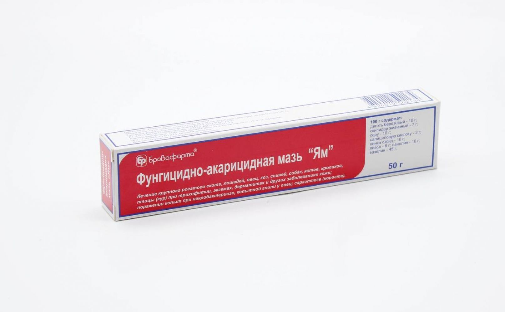 Густа мазеобразная маса від світло-сірого до темно-сірого з коричневим відтінком кольору, має специфічний запах.Состав100 грамів препарату містить:дьоготь березовий (Pix Liquida Betulae) 10 г,скипидар живичний (Oleum Terebithinae) 7 г,сірку (Sulfur) 10 г,саліцилову кислоту (Acidum salicylicum) 2 г,цинку окис (Zinci oxydum) 10 г,лізол (Lysolum) 6 г,ланолін (Lanolinum anhydricum) 10 г,вазелін (Vaselinum) 45 р. Фармакологічні свойстваATCvet QD10A, ветеринарні препарати локального действияПрепарат володіє яскраво вираженими фунгіцидними, бактерицидні та ектопаразитарними властивостями. Вони зумовлені синергічна дією речовин, які входять до складу препарату. Дьоготь березовий діє антисептично і противопаразитарно, виявляє місцеву подразнюючу, вяжучу та підсушуючу дію. Протипаразитарний і протимікробну дію сірки зумовлено здатністю при наявності вологи, лугів і органічних речовин утворювати серчистий ангідрид, сірководень, кисень і серистие луги, які діють кератопластически і кератолитически. Саліцилова кислота при місцевому застосуванні подразнює шкіру і сприяє відторгненню ороговілих клітин епітелію. На ранової поверхні посилює грануляцію, діє бактерицидно, антитоксично, фунгіцидно. Цинку окис проявляє вяжучу, підсушує і дезинфікуючу дію. Лізол проявляє протизапальну, бактерицидну та інсектицидну дію. Вазелін і ланолін в препараті виконують функцію мазевої основи.ДозированиеПеред застосуванням мазь перемішують, оскільки при тривалому зберіганні можливе розшарування компонентів, які входять до її складу. Мазь наносят тонким слоем на пораженние участки кожи и на 2-4 см вокруг них, без предидущего удаления чешуек и вистригания шерсти, при етом ее слегка втирают в кожу. Пораженние участки обрабативают 1-2 раза в сутки до отделения чешуек. Если через 4-5 суток чешуйки не отделились, втирания мази продолжают. Как правило, через 7-10 суток пораженние участки освобождаются от чешуек и на них наблюдается рост волос. После завершения обработки проводят контрольние микроскопические исследования соскобов. При виявленні збудника хвороби лікування продовжують.Протипоказання : ОтсутствуютПредостережение: Особливих застережень не має.Форма випускаТуби або пластикові контейнери по 20, 50, 90 грамів, пластикові контейнери по 250, 500 грамів, 1 кг. ХранениеВ темному місці при температурі від 0 до 25 С. Термін придатності 2 роки.Як купити Ям мазь 50гОформить замовлення через корзинуОформить замовлення за контактними телефонами