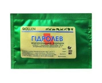 Фармакологічні властивостіАктивна речовина лівийзол гідрохлорид антигельмінтний препарат із групи тетраімідазолів. Паралізує гельмінтів, викликаючи деполяризацію їх мязів, крім того, пригнічує фумарат-редуктазу, порушуючи біоенергетичні процеси гельмінтів. Левамізол має також імуномодулювальну дію, нормалізує клітинний імунітет. Механізм імуномодулювальної дії остаточно не вияснений, вважають, що він повязаний зі стимулювальним впливом на макрофаги та T-лімфоцити.Аскорбінова кислота завдяки активації дихальних ферментів у печінці посилює її детоксикаційну та білокоутворювальну функції, підвищує синтез протромбіну. Покращує жовчовиділення, відновлює секреторну функцію підшлункової та щитоподібної залоз. Регулює імунологічні реакції (активує синтез антитіл, С3-компоненту комплементу, інтерферону), сприяє фагоцитозу, підвищує опірність організму інфекціям. Має протизапальну та протиалергічну дію. Гальмує вивільнення і прискорює деградацію гістаміну, пригнічує утворення ПГ та інших медіаторів запалення й анафілаксії. Знижує потребу в вітамінах В1, В2, А, Е, фолієвій кислоті, пантотеновій кислоті.Глюкоза завдяки участю в різних процесах обміну речовин є джерелом цінної легкозасвоюваної поживної речовини. У разі метаболізму глюкози в тканинах виділяється чимала кількість енергії, необхідної для життєдіяльності організму, покращує обмін речовин підвищує скоротність міокарда покращує антитоксичну функцію печінки, розширює судини, збільшує диуріз.Гідролев комбінований препарат із чітко вираженим антигельмінтною, імуностимулювальною дією і завдяки аскорбіновій кислоті та глюкозі з помірною токсичністю.Показання для використанняЛікування та профілактика шлунково-кишкових і легеневих гельмінтозних захворювань, викликаних збудниками:велика рогата стрічка, вівці, кози:Haemonchus spp., Ostertagia spp., Trichostrongylus spp., Cooperia spp., Nematodirus spp., Oesophagostomum spp., Bunostomum spp., Trichurus spp., Strongyloides spp., Dictyocaulus spp.свині:Ascaris spp., Oesophagostomum spp., Trichuris spp., Strongyloides spp., Hystrongylus spp., Metastrongylus spp.птиця (кури, гуси, індички, блакитні):Ascaridia galli, Heterakis gallinarum, Capillaria spp., Trichostrongylus spp.кролики:Passalurus spp., Protostrongylus spp., Trichocephalus spp., Trichuridae spp.Спосіб застосування та дозиВелика рогата худоба, вівці, свині одноразово, орально з водою або кормом 1 г на 10 кг маси тіла.Птиця орально з водою 4 г на 1 л води однаково або по 1 г на 1 літр води впродовж 4 діб.Голубам- 1 г препарату на 200 мл води. Упродовж оброблення птиці, інших джерел води не має бути.Кролики орально з водою 1 г на 1 л води впродовж 3-х діб.ПротипоказанняНе застосовувати самкам в останній треті вагітності, курам-несушкам, яйця яких використовуються в їжу людям, і виснаженим тваринам.Не застосовувати разом із фосфорорганічними препаратами, і з пірантелом, морантелом, неостигміном.ЗастереженняКаренція мясо 7 діб, молоко та яйця 3 доби.У разі забою раніше встановленого терміну, мясо використовують для годування щільноїдних тварин або для виготовлення мясо-костного борошна, а молоко випаюють непродуктивним тваринам.Форма випускуПакети з плівки металізовані, пластикові контейнери по 12 г.Умови зберіганняУ сухому темному місці за температури від +5 C до +25 C.Термін придатності3 роки.