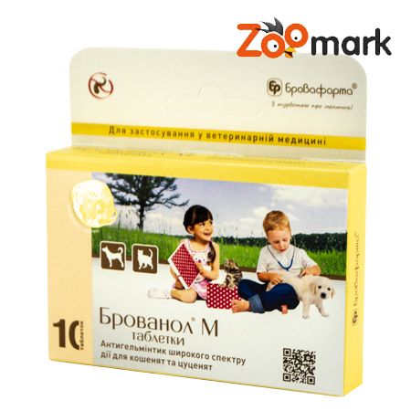 Опис:Таблетки плоскі, циліндричні зі скошеними краями, з насічкою для поділу на одному боці та логотипом виробника на іншого, жовтого кольору зі слабким характерним запахом.Склад:Одна таблетка (1 г) Брованол- М містить: никлозамид 92 мг оксибендазол 12 мг левамізолу гідрохлорид 16 мг.Фармакологічна дія:Препарат має сукупні фармакологічні властивості трьох компонентів, які забезпечують широкий спектр противопаразитарного дії, а саме:никлозамид при пероральному застосуванні не всмоктується з травного тракту і при контакті з стрічковими гельмінтами гальмує оксидационно-фосфоролитические процеси, призводить до ослаблення і швидкої загибелі сколексів і сегментів паразитів, які частково перетравлюються і відходятьоксибендазол у нематод порушує метаболізм глюцидов, блокуючи утворення АТФ, що викликає параліч і загибель паразитів на всіх стадіях розвитку вже через кілька годин після введення.левамізол посилює нематодоцидное дію оксибендазола, є ефективним імуномодулятором і при подальшої вакцинації сприяє утворенню високого рівня поствакцинального імунітету.Застосування:Собакам і котам для лікування і профілактики змішаних інвазій, викликаних личинками і дорослими гельмінтами шлунково-кишкового тракту: анкілостомоз (Ancylostoma caninum), дипилидиоз (Dipylidium caninum), дифілоботріоз (Diphyllobothrium latum, D. minus), токсокароз (Toxocara canis, T. cati), токсаскаридоз (Toxascaris leonina), трихоцефаллез (Trichocephalus vulpis і T. nutpia), теніоз (Taenia hydatigena, T. multiceps), унцинариоз (Uncinariastenocеphala) і деяких інших.Якщо у собак одночасно з гельмінтозами підтверджено наявність ектопаразитів (бліх, вошей, кліщів), тоді замість препарату Брованол- М слід застосовувати Брованолплюс.Дозування:Для цуценят і кошенят: одна таблетка Брованола-М на 4 кг. Зазначену дозу слід розділити навпіл і давати з добовим інтервалом.Цуценятам першу дегельмінтизацію проводять напередодні вакцинації у віці 4-5 тижнів, кошенятам у віці 6 тижнів. В подальшому кожні 3-4 місяці бажано проводити профілактику в зазначених дозах .Протипоказання:Атонія кишечнику.Застереження:Не перевищувати зазначених доз. У незначної частини тварин при сильній инвазированности внаслідок інтоксикації перевареними частинами гельмінтів, можлива поява кропивянки та свербежу в області прямої кишки, занепокоєння, діареї, блювоти. Всі ці ознаки швидко зникають без спеціального втручання.Форма випуску:Блістери по 10 таблеток або пластмасові контейнери по 100 і 1000 таблеток.Зберігання:В сухому, темному місці при температурі до 25 С.Термін придатності 3 роки.