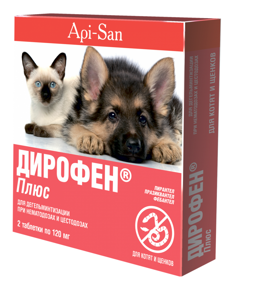 Дирофен плюс для кошенят і цуценят 6 таблетокСкладДирофен таблетки комбінований антигельмінтик для тварин. В 1 г таблеток міститься 50 мг фенбендазола і 15 мг пірантелу памоату, а також допоміжні компоненти. ПоказанняПрофілактика і лікування нематодозів і цестодозов у цуценят і кошенят (включаючи змішані інвазії у тварин).Дози і спосіб застосуванняДирофен таблетки задають тваринам всередину одноразово індивідуально в ранкове годування з невеликою кількістю корму (у шматок ковбаси, мяса, з фаршем або кашею) в дозі 1 таблетка препарату на 1 кг маси тіла. Попередньої голодної дієти і застосування проносних засобів при використанні препарату не потрібно. З профілактичною метою дегельмінтизацію проводять раз на 3 місяці, а також перед кожною вакцинацією. Лікувальні заходи проти нематод і цестод проводять за показаннями. При сильному ступені інвазії Дирофен таблетки можна застосувати повторно через 10 днів.