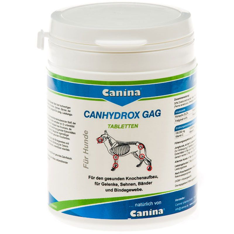 Опис Canhydrox Petvital Gag ForteCanhydrox Petvital Gag Кангидрокс Петвиталь Гаг препарат, що застосовується при порушенні сполучних тканин в області хрящів, сухожиль, суглобів і звязок. Даний препарат рекомендовано застосовувати при артрозі, спондильоз або дисплазії тазостегнових суглобів. Унікальна дія препарату зумовлена вмістом у ньому гідроксиапатиту кальцію, який є основним мінеральним речовиною кісток і зубів. Регулярне застосування препарату Canhydrox Petvital Gag (або Gag Forte) допомагає збільшити витривалість собак, підвищити працездатність, особливо при фізичних навантаженнях (змагання, вагітність, полювання), доповнюючи раціон корисними натуральними речовинами.Виробником препарату є Canina pharma GmbH (Німеччина). Склад: основна складова речовина препарату це стабілізовані, культивовані, висушені за спеціальною технологією молюски Pernacanaliculus (30). Крім того, до складу препарату Canhydrox Petvital Gag також входять дріжджі, рибне борошно, морські водорості в подрібненому вигляді, карбонат кальцію. В якості добавок в даному препараті виступають DL-Метіонін, вітамін е і селен (селеніт натрію).Застосування препаратуВ якості профілактики: для цуценят від 4 до 15 місяців по 2 таб. на 10 кг вагидля собак на протяжении беременности и кормления по 2таб. на 10 кг в течение полумесяца до рождения потомства и во время его воспроизводствадля рабочих либо виставляющихся животних по 2таб. на 10 кг, начав за две недели до и на протяжении такого периода.Для лечения:для щенков с симптомами минеральной дистрофии по 4таб. на 10 кг веса в течение четирех месяцев, затем по 2таб.для взрослих особей, в том числе стареющих по 4таб. на 10 кгдля собак при растяжении связок, лечении переломов либо хромоти - по 4таб. на 10 кг курсом до 90 дней.Побічні дії: побічні дії виявлено не було. У собак з підвищеною чутливістю до початку прийому препарату можливо розлад ШКТ у вигляді запору або проносу.Купити препарат Canhydrox Petvital Gag (або Gag Forte) можна в будь-якій ветеринарній аптеці, зоомагазині, але за кращою ціною тільки у нашому інтернет-магазині.