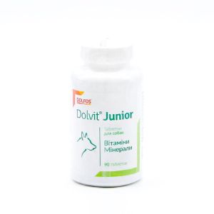 Вітамінно-мінеральна добавка Dolfos Dolvit Juniorвідмінно підійде для підтримки гарного здоровя і профілактики захворювань тварини.Збалансований комплекс вітамінів і мінералів Долвіт Юніор забезпечує правильний фізіологічний розвиток мязової маси і скелета молодих тварин. Комплекс стимулює імунітет, надає здорового та красивого вигляду шерсті, гарного самопочуття та життєвої енергії тварині. Добавку рекомендується використовувати як джерело вітамінів і мінералів протягом усього періоду розвитку цуценят від 21-денного до 18-місячного віку.Препарат необхідний для збагачення і збалансування раціонів собак за вітамінами, поживними речовинами, мікро- і макроелементами. Оптимальне співвідношення кальцію і фосфору сприяє оптимізації росту, розвитку та повноцінному формуванню кісткової тканини і зубів, своєчасній зміні зубів.Комплекс сприяє підвищенню резистентності організму (знижує ризик виникнення паразитарних хвороб для кращої імунної відповіді на вакцинацію). Сприяє зміцненню мускулатури та сухожиль, підвищує апетит.Мінерали в хелатній (легкозасвоюваній) формі збільшують активність ферментних систем і прискорюють білковий обмін, внаслідок чого контролюється фізіологічно нормальний ріст тканин і кісток.Дозування:1 таблетка на 10 кг маси тіладобавку рекомендується використовувати протягом усього періоду розвитку цуценят, починаючи з 3-х тижневого віку