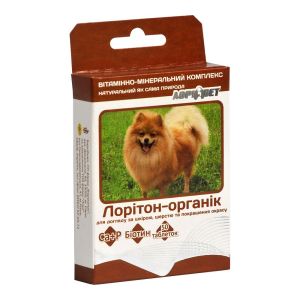 ЛОРИТОН - вітаміни по догляду за шкірою і поліпшення забарвлення шерсті 50 таблеток.Вітаміни та мінеральні речовини беруть участь в обміні речовин самостійно або в складі ферментів та необхідні для забезпечення нормального функціонування організму. Вітаміни не утворюються в організмі собак або утворюються, але в недостатній кількості. Поетому их относят к незаменимим пищевим веществам.Витаминно-минеральний комплекс ЛОРИТОН-органик для ухода за кожей, шерстью и для улучшения окраса кроме витаминов А, группи В содержит пивние дрожжи, биотин и цинк в том количестве, которое необходимо для поддержания здорового состояния кожи и шерсти. Применяют для обеспечения здорового состояния кожи, блеска и жизненной сили шерстяного покрова, предупреждения появления перхоти и преждевременной линьки. Рекомендуємо споживати собакам пр випаданні шерсті внаслідок зараження волосоїдів, грибками, при дерматитах різної етіології і в разі несезонного линьки.
