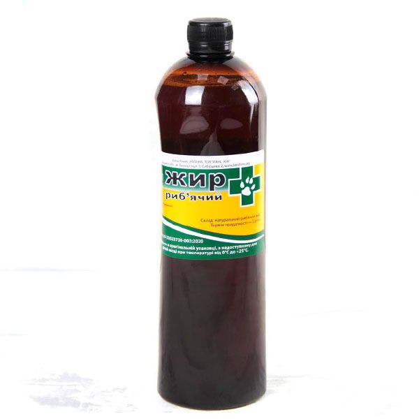 Рибячий жир для ветеринарії, - кормова добавка, застосовується для профілактики і лікування у тварин недостатності вітаміну A, рахіту, остеомаляції, хронічних інфекцій, анемії, алергії, шлунково-кишкових захворювань, виразки шлунка, статевих порушень. Використовують як загальнозміцнюючий засіб, а також для прискорення зрощення кісткових переломів. Зовнішньо призначають для лікування себореї, дерматитів, екзем, обморожень, опіків, ран і важко гояться виразок, Іритів, конюнктивітів та ін.Кормова добавка містить суміш очищених жирів морських риб, багатих поліненасиченими жирними кислотами (Omega-3, Omega-6, Omega-9, ейкозапентаєнова, докозагексаєнова) і вітамінами А і Д.являє собою маслянисту рідину від світло-жовтого до жовтого кольору, з характером рибним запахом і смаком. Розфасована по 0,5 л в пластикові флакони.ФАРМАКОЛОГІЧНІ ВЛАСТИВОСТІРибячий жир є природним джерелом вітамінів A, D і E, брому, йоду, поліненасичених жирних кислот, органічних сполук сірки і фосфору. Впливає на мінеральний обмін речовин, і в першу чергу кальцію і магнію. Регулює вироблення тромбоцитів крові. Зменшує запалення і свербіж. Зміцнює імунну систему. Сприятливо впливає на ріст і розвиток тварин. При внутрішньомязовому введенні діє як біогенний стимулятор.ДОЗИ І СПОСІБ ЗАСТОСУВАННЯРибячий жир застосовують тваринам всередину в наступних дозах: коровам - 100-500 мл, коням - 40-200 мл, вівцям і козам - 20-100 мл, свиням - 4-70 мл, собакам і песцям - 10-30 мл, кішкам - 5-10 мл, птиці - 2-5 мл, курчатам, каченятам і гусенятам - 0,3-0,5 мл. при внутрішньомязовому введенні доза рибячого жиру на одну тварину становить: рогатої худоби 10-15 мл, телятам 5-10 мл, вівцям і свиням-3-5 мл, поросятам сосунам-1-2 мл. Зовнішньо призначають при системній терапії уражень шкіри і слизових оболонок, для лікування себореї, дерматитів, екзем, обморожень, опіків, ран і виразок, які важко гояться, іритів, конюнктивітів та ін.при зовнішньому використанні змочують рибячим жиром повязки і змащують уражені поверхні.Внутрішньомязово введений рибячий жир діє подібно біогенним стимуляторам.ПОБІЧНІ ДІЇУ рекомендованих дозах і при правильному застосуванні не спостерігаються.ПРОТИПОКАЗАННЯБажано не застосовувати курчатам-бройлерам і тваринам перед забоєм, оскільки препарат надає продукції запаху риби.ОСОБЛИВІ ВКАЗІВКИТваринницьку і птахівницьку продукцію після застосування рибячого жиру можна використовувати без будь-яких обмежень.УМОВИ ЗБЕРІГАННЯУ добре закупореній посуді в захищеному від світла, прохолодному і недоступному для дітей і тварин місці. Не допускати впливу високих температур. Термін придатності - 2 роки.