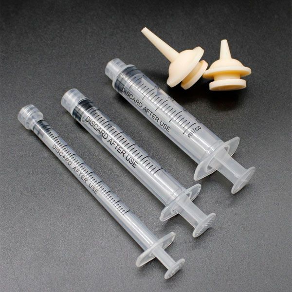 Набір з трьох шприців (шприц 5 мл, шприц 3 мл, шприц 1 мл інсуліновий) і високоякісних мякіх силіконових сосок різної довжини іх в наборі 2 шт: одна 1 см, друга 2 см (це розмір самої частини для вигодовування).Шприц має шкалу, щоб ви могли відразу побачити, скільки зїв ваш вихованець, підходить для води, ліків, молока.