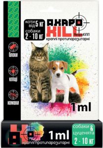 ОписаниеПрозрачний розчин світло-жовтого кольору.Состав1 мл препарату містить діючі речовини: фіпроніл - 70 мг, цифлутрин - 3 мг, пирипроксифен - 20 мг. Допоміжні речовини: етилацетат, поліетиленгліколь-400.ПрименениеАкароКИЛЛ застосовують собакам з 10-тижневого віку для лікування ентомозов, що викликаються блохами, вошами і волосоїдів, акарозов, що викликаються саркоптоидними і іксодовими кліщами, а також з метою захисту тварин від нападу кровосисних двокрилих комах.ДозировкаАкароKILL завдають тваринам крапельно на суху, неушкоджену шкіру в місця, недоступні для злизування область спини між лопатками або область шиї біля основи черепа), в дозах, вказаних в таблиці:Вид і маса животногоДоза препарату, мл на животноеСобаки і цуценята від 2 до 10 кг1 млСобаки і цуценята від 10 до 20 м2 млСобаки і цуценята від 20 до 40 кг4 млСобаки масою більше 40 кг5,5 млПеред використанням на тубі-піпетці відкручують захисний ковпачок і, тримаючи її вертикально вгору носиком, відрізають кінчик носика (близько 1 мм). Розсунувши шерсть на тілі тварини, наносять препарат на шкіру в недоступних для злизування місцях (між лопатками на холку і уздовж спини), в 2-5-ти точках (в залежності від маси тіла тварини). Для запобігання витіканню розчину в одну точку не слід при нанесенні сильно натискати на тубу-пипеткуПродолжительность захисної дії становить: від кліщів - 1 місяць від комах у собак - 3 місяці і у кішок - 2 місяці. Повторну процедуру слід проводити не частіше ніж один раз на місяць. З метою запобігання повторної інвазії підстилку для тварин слід замінити або обробити дозволеним до використання інсекто-акарицидну засобом згідно інструкції-вкладиша. Не слід наносити препарат на вологу або пошкоджену шкіру, а також купати та мити тварину протягом 48 годин після обробки.Дія препарату проявляється через 12-24 години, враховуючи це, обробки слід проводити не пізніше, ніж за 24 години до передбачуваного вигулу тварин в місцях можливого знаходження ектопаразитів (парки, сквери, ліс).Для знищення іксодових кліщів на тілі тварини препарат в кількості 1-2 крапель наносять на кліща і місце його прикріплення до шкіри. Якщо протягом 20-30 хвилин кліщ мимовільно не відпадає, його акуратно витягують з тіла і знищують.Повторні обробки для попередження нападу комах і іксодових кліщів і профілактики кровепаразитарних хвороб (бабезіоз, ерлихиоз, бореліоз) проводять за показаннями протягом усього сезону активності паразитів, але не частіше 1 разу в місяць.Для лікування отодектозу (вушної корости) препарат застосовують одноразово в кожне вухо по 2-3 краплі (краплини обовязково вводять в обидва вуха). Для рівномірного розподілу препарату вушну раковину складають навпіл і злегка масажують у підстави. Залишок препарату з використовуваної піпетки (у розрахунку на масу тварини), наносять на шкіру між лопаток. У процесі лікування рекомендується очищати слуховий прохід від ексудату і струпів, а в разі ускладнення отит, призначати протимікробні та протизапальні засоби. При необхідності через 10-12 днів курс лікування повторюють під контролем мікроскопії зіскрібків.При псороптозе, саркоптоз і нотоедрозе препарат застосовують 2-3-кратно з інтервалом 10-12 днів до клінічного одужання тварини, що підтверджують двома негативними результатами мікроскопічних досліджень зіскрібків з уражених ділянок ш