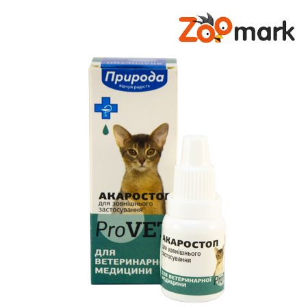Склад і фармакологічні властивостіПрепарат містить амітраз - акарицид контактної дії, який активний відносно отодектозних, саркоптоидних, нотоедрозних, і демодекозних кліщів.Що входить до складу препарату допоміжний компонент - диметилсульфоксид допомагає діючої речовини краще проникати до місць ураження паразитами, при цьому посилює ефект лікування. Має виражену протизапальну, бактерицидну і помякшувальною дією.Показання до застосуванняЛікування собак, котів, кроликів при отодектозе, саркоптоз, нотоендрозе і демодекозі.ЗберіганняЗберігати препарат у сухому темному місці, окремо від продуктів харчування і кормів, у недоступному для дітей та тварин місці, при температурі від 4 до 25 С.Дозування і спосіб застосуванняДля лікування тварин при отодектозе вушні раковини і зовнішній слуховий прохід попередньо очищають від струпів і кірок тампоном, який змочують препаратом, потім закапують по 2-3 краплі препарату, залежно від розміру вушної раковини, в кожне вухо (навіть у випадку поразки тільки одного). Для повної обробки поверхні вуха, вушну раковину складають уздовж навпіл і злегка масажують. Щоб уникнути злизування тваринам, а також для кращого ефекту після обробки, тварина укутати на 50 хвилин. Для лікування саркоптоз, нотоедроза і демодекозу препарат наносять на попередньо очищені уражені ділянки шкіри, за допомогою тампона з розрахунку 0,5 мл на 1 кг маси тіла тварини, злегка втираючи від периферії до центру з захопленням до 1 см прикордонної здорової шкіри. Щоб уникнути злизування тваринам, а також для кращого ефекту після обробки, тварина укутати на 30 хвилин.ПротипоказанняНе застосовувати вагітним і лактуючим самкам, а також цуценят і кошенят віком до 2-х місяців.Форма випускуПолімерні флакони з крапельницею по 10 мл у картонних коробках.Як купити Акаростоп ProVET краплі 10млОформити замовлення через корзинуОформити замовлення по контактним телефонам
