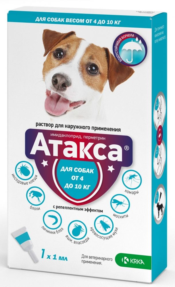 Краплі для захисту собак від укусів іксодових кліщів, бліх і комарів з тривалою захисною і репелентною дією.Спектр дії:Іксодові кліщі, блохи, воші, волосоїди, комарі, кровоссальні мухи.Атакс відноситься до групи комбінованих інсектицидних препаратів. Застосовують для знищення імагінальних, преімагінальних і личинкових фаз розвитку вошей, бліх, волосоїдів, що паразитують на собаках, а також для захисту тварин від нападу вошей і волосоїдів.I. Загальні відомості:1.Найменування лікарського препарату для ветеринарного застосування: торговельне найменування Атакс (Ataxxa) міжнародні непатентовані найменування діючих речовин: імідаклоприд,перметрин.2.Лікарська форма: Розчин для зовнішнього застосування. Атакса в 1 мл в якості діючих речовин містить імідаклоприд - 100 мг і перметрин - 500 мг, а також допоміжні речовини: диметилсульфоксид, N-метилпіролідон, Тригліцериди середнього ланцюга, лимонну кислоту і бутилгідрокситолуол.3.За зовнішнім виглядом являє собою прозору рідину від жовтого до світло-коричневого кольору. Термін придатності препарату при дотриманні умов зберігання-3 роки з дати виробництва. Забороняється застосування препарату після закінчення терміну придатності.4.Випускають препарат розфасованим по 0,4 1,0 2,5 і 4,0 мл в полімерні піпетки, закупорені захисним ковпачком. Кожну піпетку упаковують в пакет з фольги. Пакети з піпетками по 1 або 4 штуки упаковують в картонні пачки разом з інструкцією із застосування.5.Зберігають лікарський препарат в закритій упаковці виробника в захищеному від прямих сонячних променів місці, окремо від харчових продуктів і кормів, при температурі від ООСдО250С. не застосовувати після закінчення терміну придатності.6.Препарат слід зберігати в місцях, недоступних для дітей.7.Невикористаний препарат утилізують відповідно до вимог законодавства.8.Відпускається без рецепта ветеринарного лікаря.II.Фармакологічні властивості:9.Препарат Атакса відноситься до фармакотерапевтичної групи - інсектоакарицидні засоби в комбінаціях.10.Імідаклоприд і перметрин, що входять до складу препарату, володіючи синергідним ефектом, надають виражену інсектицидну, акарицидну і репеллентное дію.Препарат АтаксаЕфективний проти імагінальних і преімагінальних і личинкових фаз розвитку бліх (Ctenocephalides canis, Ctenocephalides felis), волосоїдів (Trichodectes canis), іксодових кліщів (Rblpicephalus sanguineus і Ixodesricinus, Dermacentor reticulatus), що паразитують на собаках, забезпечує захист тварин від нападу комарів (Aedes aegypti, Culex pipiens), мух (Stomoxys calcitrans) і москітів (Phlebotomus papatasi, Phlebotomus perniciosus). Знижує ризик можливої передачі тваринам трансмісивних захворювань, таких як: бореліоз, рикетсіоз, лейшманіоз, а також збудника собачого ерліхіозу (Ehrlichia canis) та ін. Імідаклоприд відноситься до хлоронікотініловим інсектицидів, які взаємодіють з ацетилхоліновими рецепторами членистоногих, порушують передачу нервових імпульсів, викликаючи загибель насемкомих. Діючи як активатор нервового вузла членистоногих, імідаклоприд посилює також інсектицидну дію перметрину.Після застосування препаратуАтакса його активні компоненти, практично не всмоктуючись у системний кровотік, швидко розподіляються по поверхні тіла і, утримуючись на епідермісі і шерсті, чинять тривалу (до 4-х тижнів) контактну інсектицидну дію.Атакса за ступенем впливу на організм відноситься до помірно небезпечних речов