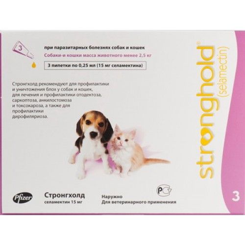 Склад і форма випускуСтронгхолд містить в якості діючої речовини селамектин. За зовнішнім виглядом представляє собою прозорий, безбарвний або блідо-жовтого кольору розчин для зовнішнього застосування з вмістом 6 або 12 селамектина.У формі 6 розчину препарат розфасовують в полімерні піпетки по 0,25 мл і 0,75 мл у формі 12 розчину по 0,25 мл, 0,5 мл, 1,0 мл і 2,0 мл Упаковують по 3 піпетки в блістери, які вкладають у картонні коробки.Показання до застосуванняПризначають собакам і кішкам:Для знищення бліх (Сtenocefalides spp.) та профілактики повторного зараження тварин протягом одного місяця після нанесення препаратуДля лікування алергічного блошиного дерматиту у складі комплексної терапіїДля профілактики і лікування отодектозу (вушного кліща), викликаного O. cynotis, і саркоптоз, спричиненого S. scabieiДля дегельмінтизації при токсокарозе, викликаному Toxocara cati, Toxocara canis, і анкилостомозе, викликаному Ancylostoma tubaeformДля профілактики дирофіляріозу в регіонах, де реєструють Dirofilaria immitisДозування і спосіб застосуванняСтронгхолд застосовують тільки зовнішньо. Перед нанесенням препарату піпетку виймають з блістера і, тримаючи вертикально, натискають на ковпачок з тим, щоб проткнути фольгу, закриває піпетку, потім ковпачок знімають.Препарат наносять безпосередньо на суху шкіру тварини. Для цього розсовують шерсть між лопатками біля основи шиї і повністю видавлюють вміст піпетки, уникаючи його потрапляння на руки. Не слід масажувати місце нанесення препарату.Стронгхолд призначають одноразово, дозу вибирають з урахуванням виду і ваги тварини. У кожному конкретному випадку наносять розчин з однієї піпетки з ковпачком відповідного кольору, при цьому доза в розрахунку на діючу речовину становить 6 мг селамектина на 1 кг ваги тварини. У разі одночасного зараження тварини кількома видами паразитів, рекомендується одноразове нанесення стронгхолда у вищевказаній дозі.Дози стронгхолда для тваринСобаки масою (кг)Колір ковпачка піпеткиНомінальний обєм піпеткиМенше 2,5Ліловий0,25 мл2,6 5,0Фіолетовий0,25 мл5,1 10,0Коричневий0,5 мл10,1 20,0Червоний1,0 мл20,1 40,0Темно-зелений2,0 млБільше 40Відповідна комбінація піпетокВідповідна комбінація піпетокКішки масою (кг)Колір ковпачка піпеткиНомінальний обєм піпеткиМенше 2,5Ліловий0,25 мл2,6 7,5Блакитний0,75 млПонад 7,5Відповідна комбінація піпетокВідповідна комбінація піпетокДля знищення бліх та профілактики повторного зараження: стронгхолд застосовують 1 раз на місяць протягом сезону активності бліх. Препарат знищує дорослих бліх, які знаходяться на собаках і кішках, через 24 26 годин після нанесення і оберігає від повторної інвазії протягом 30 днів. Знищуючи яйця бліх, стронгхолд перериває цикл розвитку паразита і не дає можливості зявитися наступної генерації бліх.Щомісячне застосування препарату не тільки прямо захищає тварин від зараження, але також знищує залишкову популяцію бліх (яйця і личинок) в будинку або квартирі. При цьому використання препарату необхідно починати за місяць до настання сезону активності бліх. Стронгхолд вже через місяць після першого застосування забезпечує різке зниження чисельності бліх у місцях проживання тварини.Препарат може бути використаний також як один з компонентів терапії алергічного блошиного дерматиту, при цьому наносити його необхідно щомісяця.Лікуванняотодектозу(вушної корости) у собак і кішо