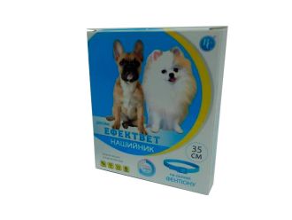 Эффектвет нашийник для собак дрібних порід 35 см на основі фентиона ВетсинтезОписаниеПолимерная стрічка з пряжкою блакитного кольору зі специфічним запахом складових компонентів.СоставЛента полівінілхлоридна (355см) містить діючу речовину:фентіон - 0,5-0,7 р. ПрименениеПрофилактика і лікування собак при ураженні ектопаразитами: блохами (Ctenocephalides felis), вошами (Linognathides spp.), кліщами (Demodex canis, D. felis, Otodectes cynotis), волосоїдів (Ttrichodectes canis), чутливими до фентиону.ДозированиеОшейник виймають з упаковки і одягають на шию тварини, фіксують таким чином, щоб між шиєю і нашийником залишався невеликий проміжок 1-2 см, потім закріплюють пряжкою і обрізають надлишок стрічки. Довжина нашийника регулюється в залежності від розміру тварини. Підігнаний належним чином нашийник в закріпленому стані повинен вільно рухатися.Постійне використання нашийника забезпечує захист тварини від ектопаразитів протягом 6 місяців.ПротивопоказанияНе застосовувати цуценятам до 4-х місячного віку.Не застосовувати ослабленим і хворим тваринам і тваринам з підвищеною індивідуальною чутливістю до фентионуНе застосовувати тваринам під час вагітності і лактацииПредостережениеПри роботі з препаратом дотримуватися основних правил гігієни та безпеки, прийняті при роботі з ветеринарними препаратами.Упаковку з нашийником відкривати безпосередньо перед застосуванням. Маніпуляції з нашийником проводити в захисних гумових рукавичках, після маніпуляцій слід ретельно вимити руки теплою водою з милом вимити і просушити рукавички. Уникати контакту маленьких дітей з тваринами, у яких є нашийники.ХранениеХранят нашийник в захищеному від світла місці при температурі від 5 до 25С.