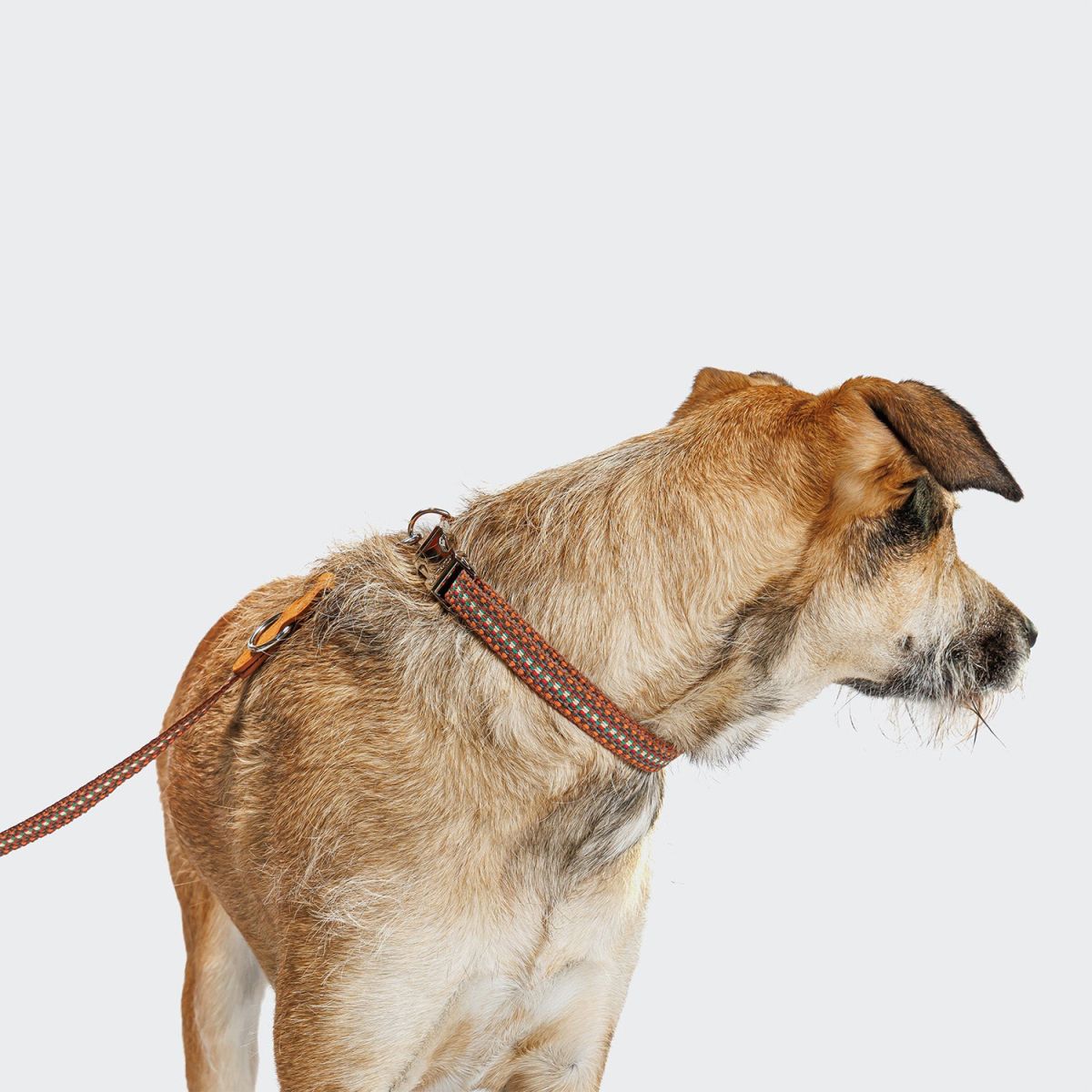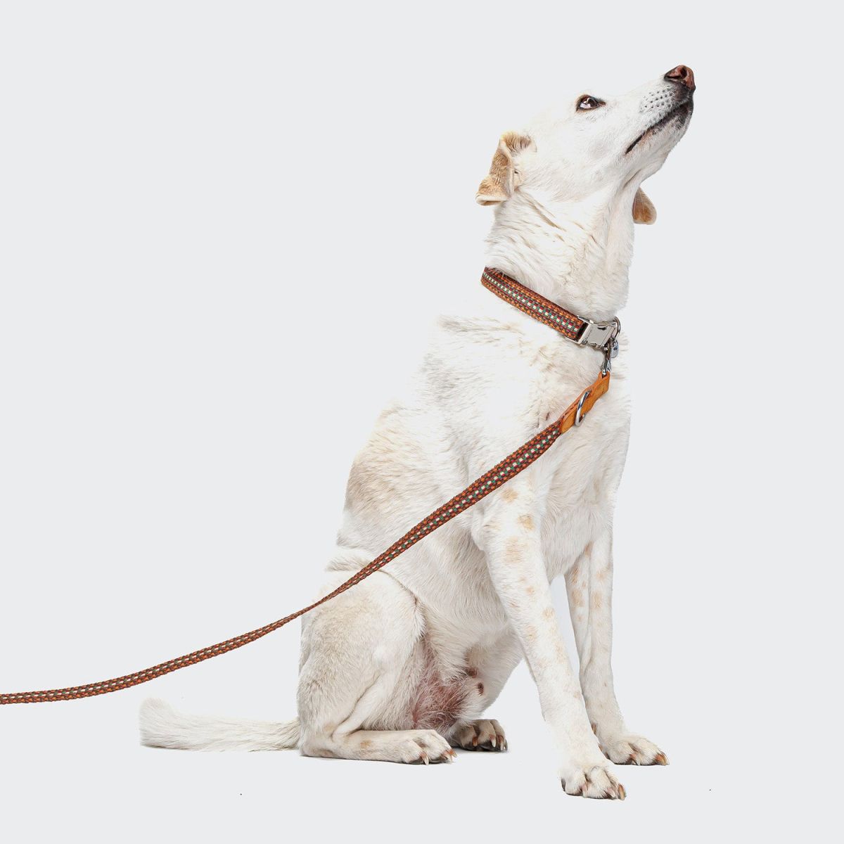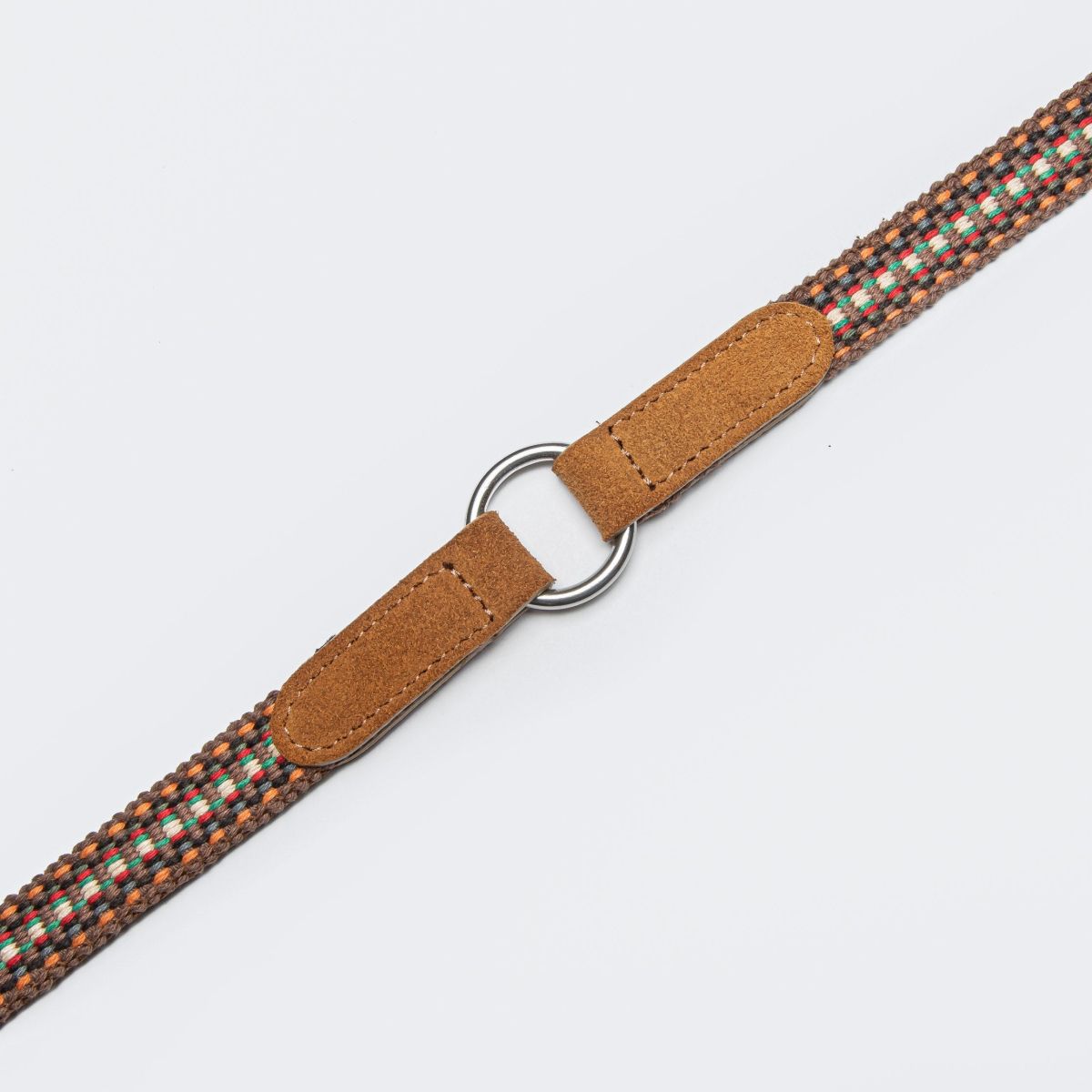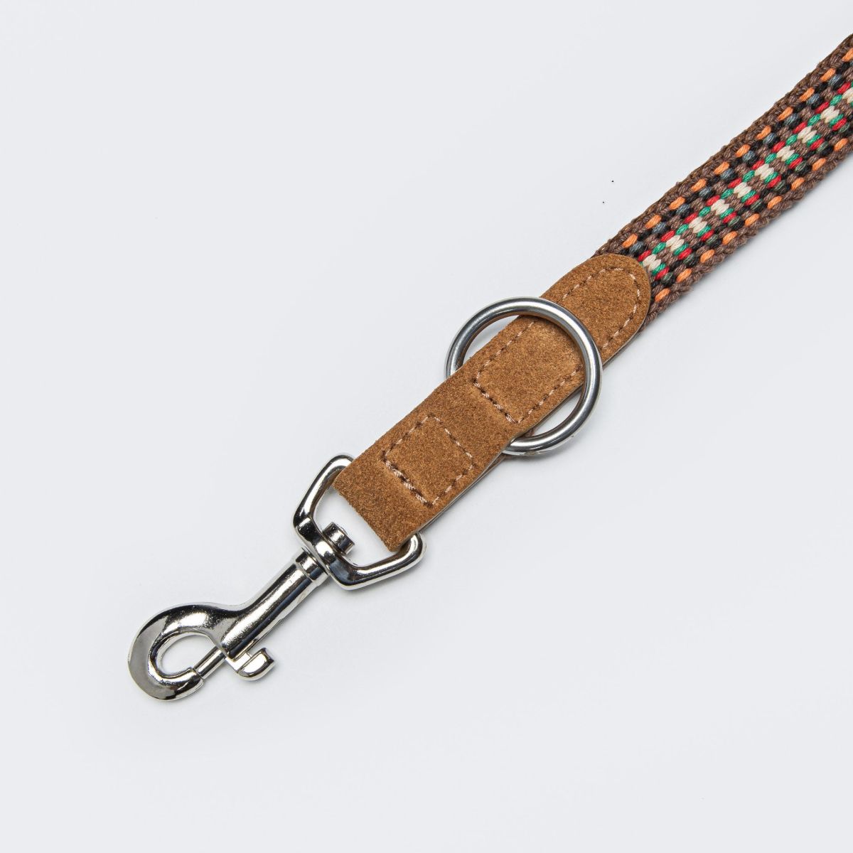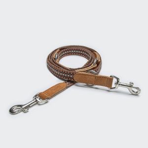 Регульований за довжиною повідок, виготовлений із фактурної тканини у яскравому поєднанні помаранчевого, коричневого та білого кольорів, доповнений елегантною світло-коричневою замшею.