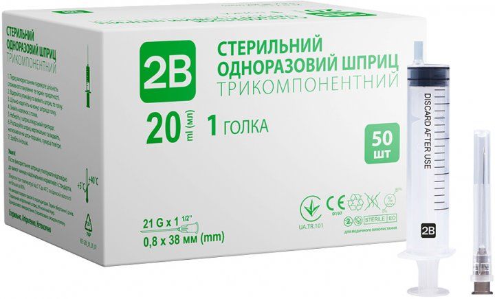 Шприц одноразовий стерильний 2B, 20 мл трикомпонентний 21Gх1 2 0,8х38 см