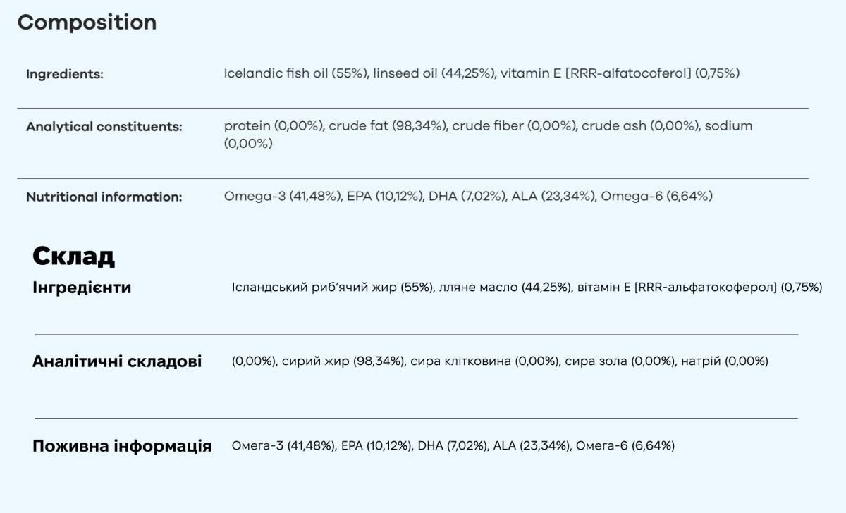 - Збалансоване співвідношення Омега-3 та Омега-6: Забезпечує оптимальне співвідношення для здоров'я шкіри.