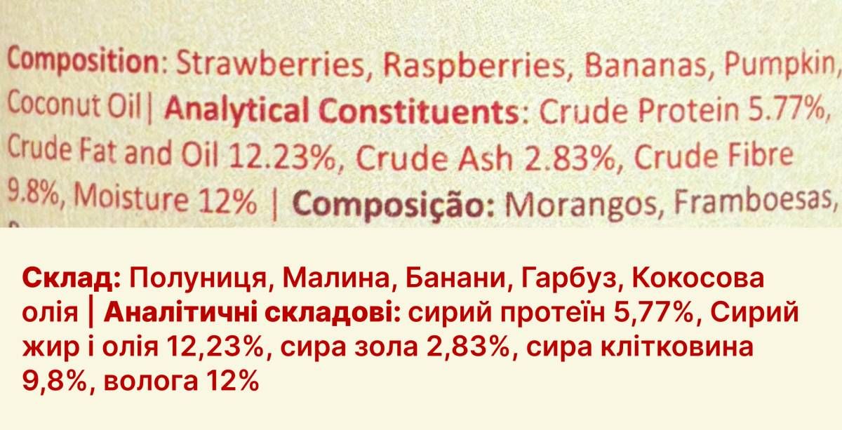 У складі – малина, клубника, банан та інші корисні фрукти, які дбають про самопочуття вашого собаки та додають у його раціон яскравих смаків.
