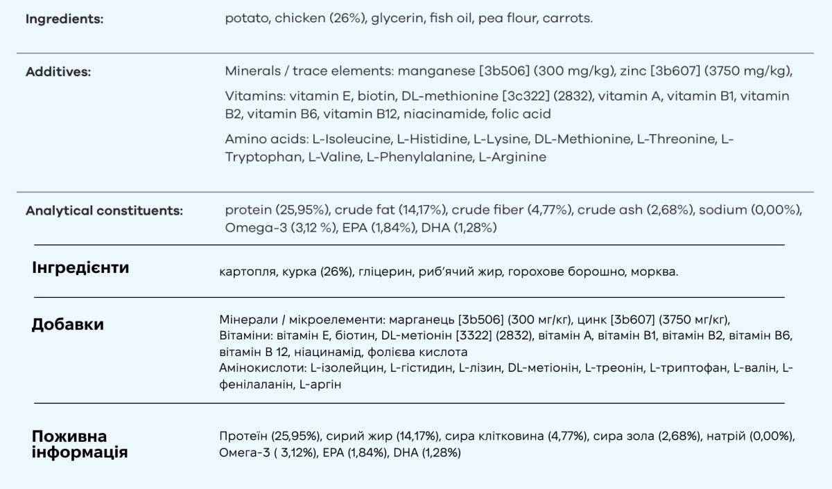 - Амінокислоти: Підтримують здоров'я та регенерацію шкіри та шерсті.