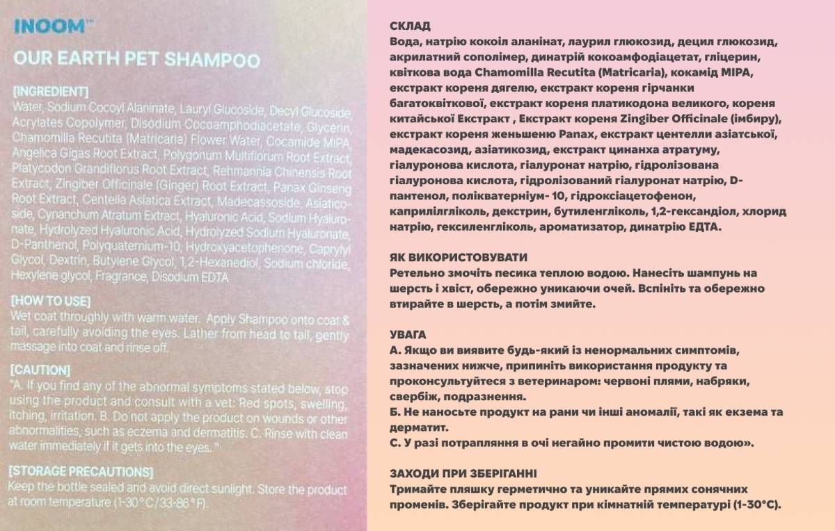 • Сертифікована клінічна безпека: INOOM Our Earth Pet Shampoo пройшов ретельне клінічне випробування та отримав