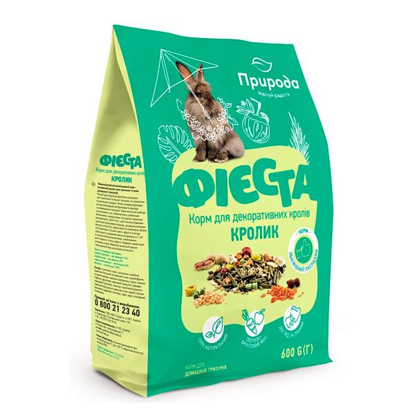 Радикально відрізняється від корму інших великих гризунів. Ця відносно недавня штучна мутація гризунів має ряд особливостей. Довгий кишечник кролика і досить слабка мікрофлора можуть давати розлади травлення при найменших збої якості корму. Тому зернові компоненти доповнюються спеціально приготованим гранулятом не тільки поживною, але й містить субстанції для розмноження корисних бактерій травлення. Не забувайте додавати в раціон Вашого улюбленця ласощі Фієста. Застосування: годувати 1 - 2 рази на день невеликими порціями, корм кожен раз насипати в чисту, суху годівницю. Слідкуйте за тим, щоб в поїлці завжди була свіжа вода. Склад:овес , пшениця , горох , насіння соняшнику, кукурудза, арахіс, подрібнені сушені фрукти, насіння гарбуза, злаковий фруктово-овочевий гранулят, кероб, травяне борошно в гранулах, повітряна кукурудза