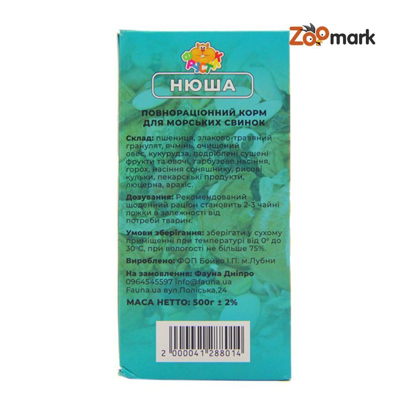 Повнораціонний корм для морських свинокСклад: пшениця, злаково-травяний гранулят, ячмінь, очищень овес, кукурудза, подрібнені сушені фрукти та овочі, гарбузове насіння, горох, насіння соняшнику, рисові кульки, пекарскькі продукти, люцерна, арахіс.Дозування: рекомен-дованих щоденний раціон становить 2-3 чайні ложки в залежності від потреби тварин.Умови зберігання: зберігати в сухому приміщенні за температури від 0до 30С, при вологості не більше 75.Вироблено: ФОП Бойко, І.П. м. ЛубниНа замовлення: Фауна ДніпроМАСА НЕТТО: 500 г 2