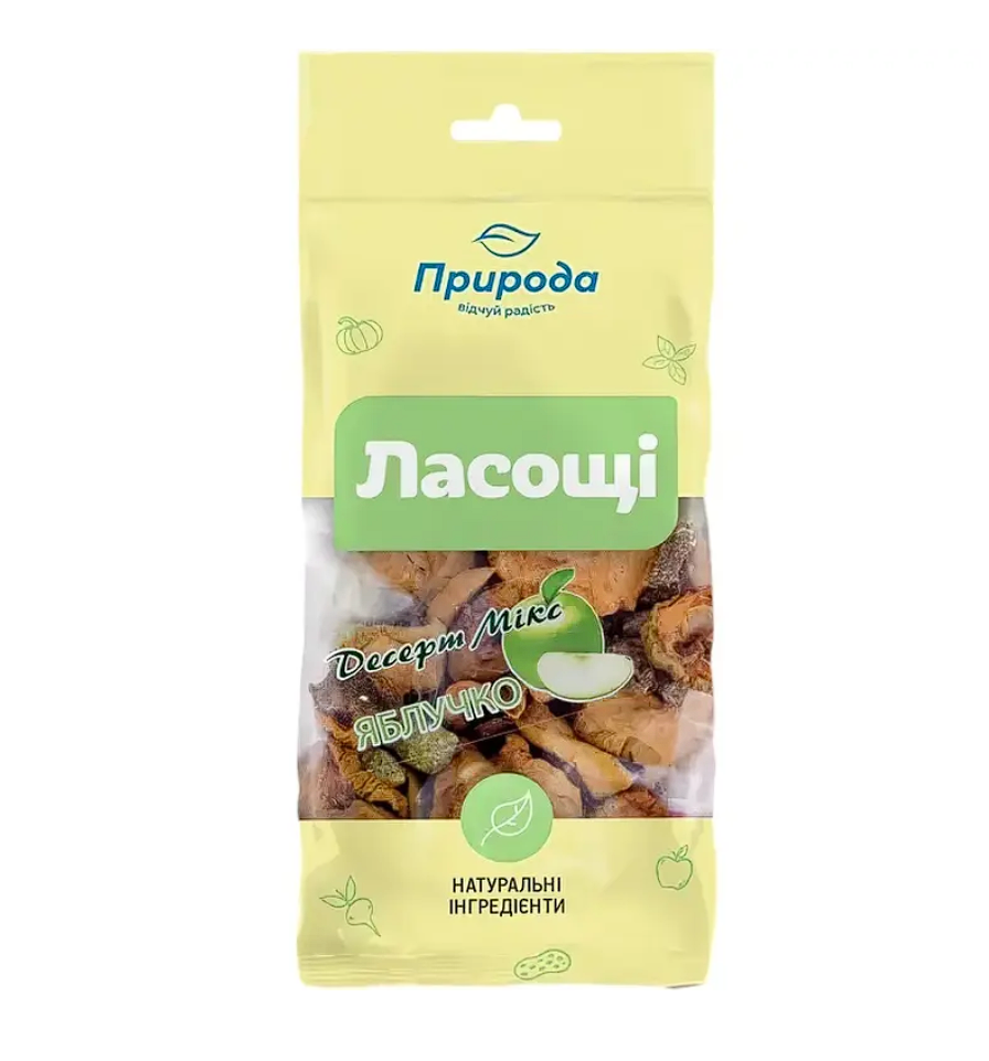 Особливості:зневоднені шматочки яблук складають основну частину десертувуглеводи та пектини сприяють правильному обміну речовин, нормалізують травлення, покращують загальний стан вихованцятравяний та зерновий грануляти урізноманітнять ласощі, а сухі буряки збагачують цінними мінералами та амінокислотами.Склад товару:сухі яблука, сушені буряки, насіння соняшнику, травяний гранулят, зерновий гранулят