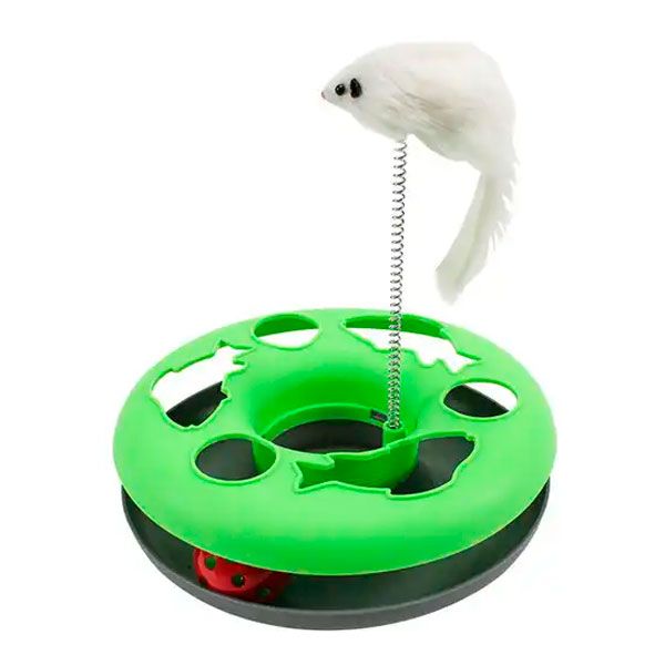 Іграшка Злови мишу, 25 см у діаметрі та 26 см у висоту.У треку є мяч, яким кішка із задоволенням ганяє, і миша на пружинці, на яку кошеня наскочить і полює, а миша ж нікуди не дівається.Така іграшка надовго займе вашу кішку.