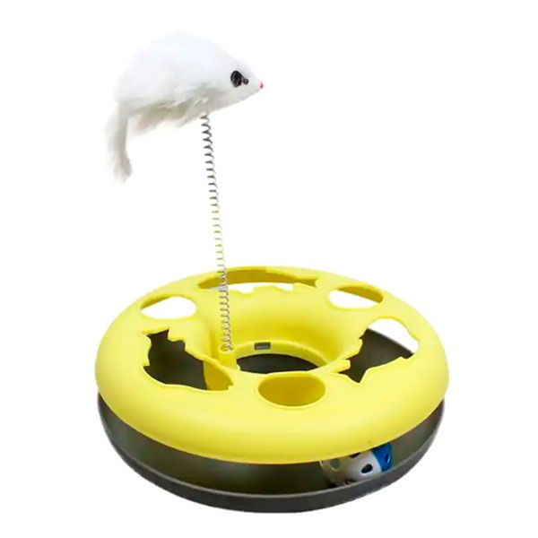 Іграшка Злови мишу, 25 см у діаметрі та 26 см у висоту.У треку є мяч, яким кішка із задоволенням ганяє, і миша на пружинці, на яку кошеня наскочить і полює, а миша ж нікуди не дівається.Така іграшка надовго займе вашу кішку.