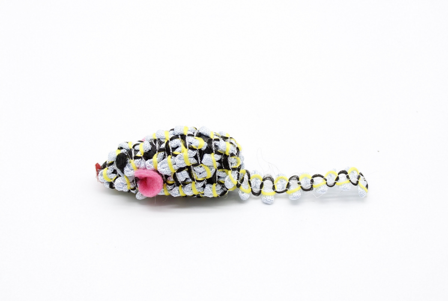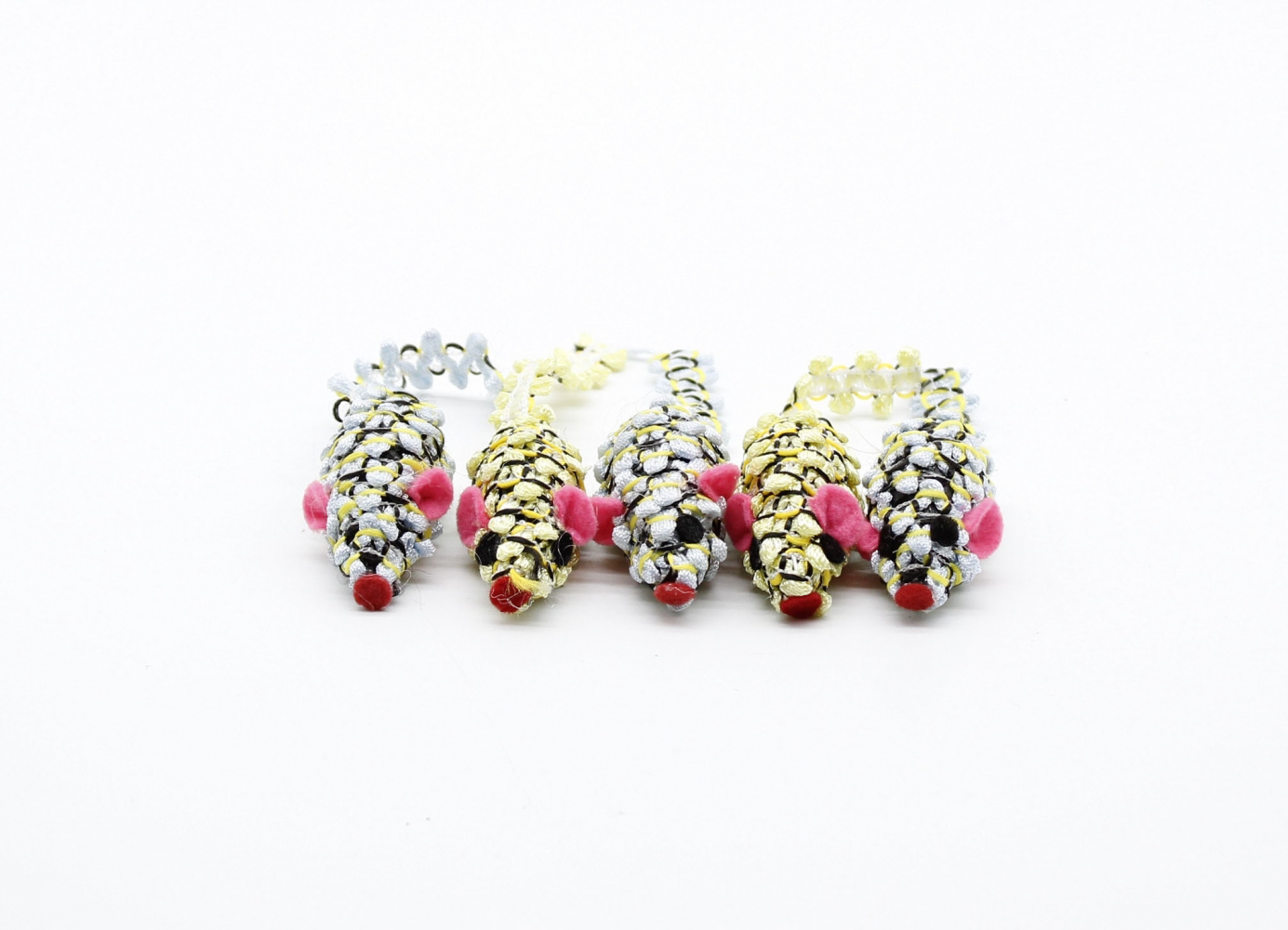 Набір з 5 мишок. Мишки маленькі - 4 см. Виготовлені з букльованої нейлонової нитки, яка обмотана навколо основи. Іграшки яскраві та міцні, і добре чіпляються за кігті кішки. Під час гри видають торохтливий звук.