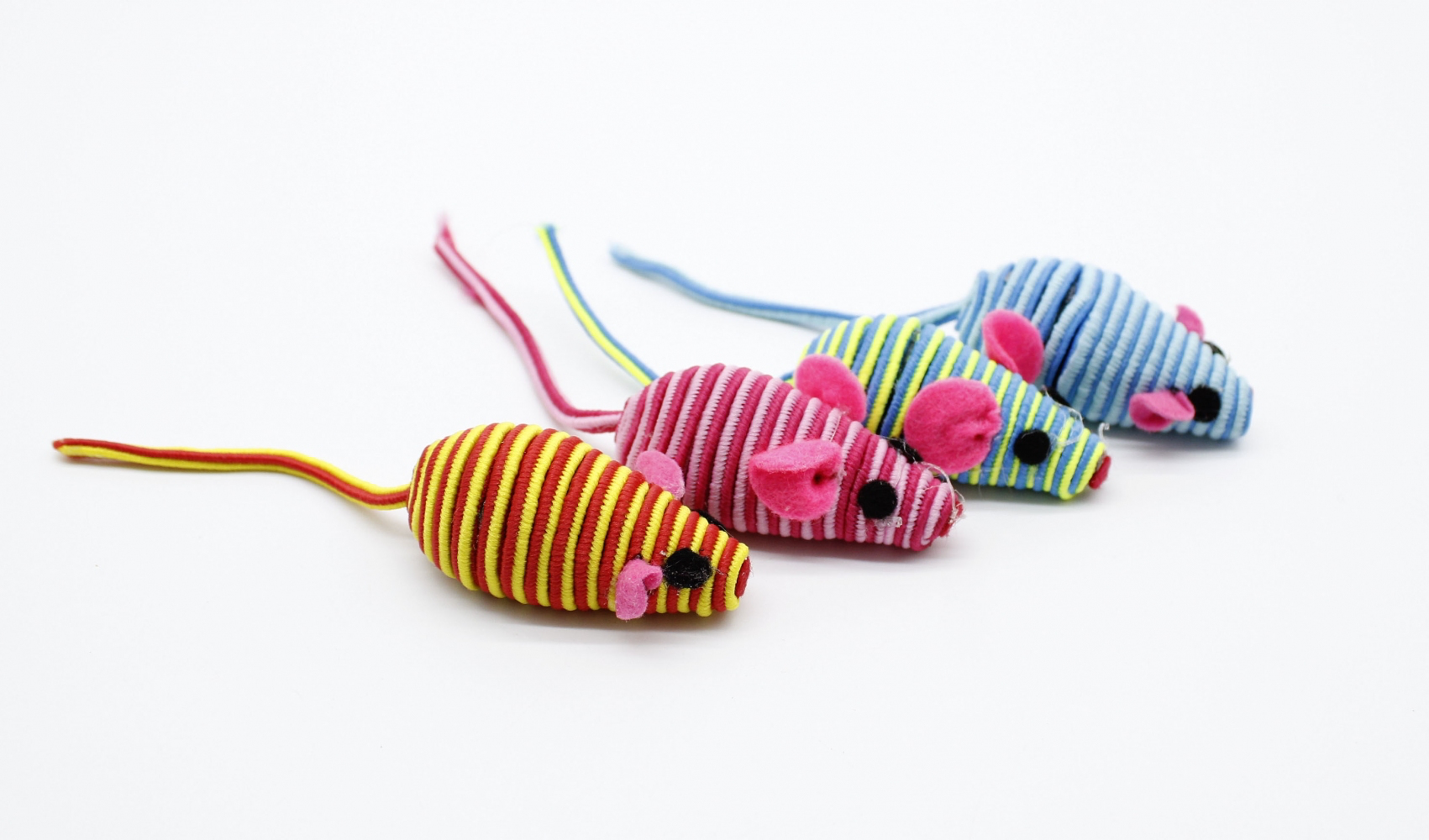 Набір з 4 мишок. Мишки маленькі - 5 см. Виготовлені з прогумованої нейлонової нитки, яка обмотана навколо основи. Іграшки яскраві та міцні, беззвучні.