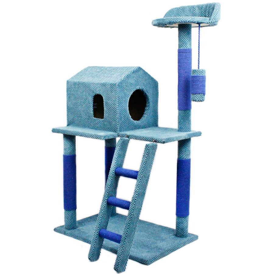 Висота 115 см, довжина 60 см, ширина 40 см.Є 4 стовбчики висотою 50 см діаметром 7 см.Драбинка 11х18х7 см, довжина самих перемичок (вони обробленні чорною ниткою) 14 см.Зверху є відкритий лежак розміром 30х30х7 см, з якого звисає іграшка 15 см, діаметр її 7 см.Також на середній платформі розташован будинок 30х30х35 см, який має вхід 20х20 см і віконце 10х8 см, будинок знаходиться на платформі, розміри її біля входу 25х30х2 см, біля віконця 34х10х2 см