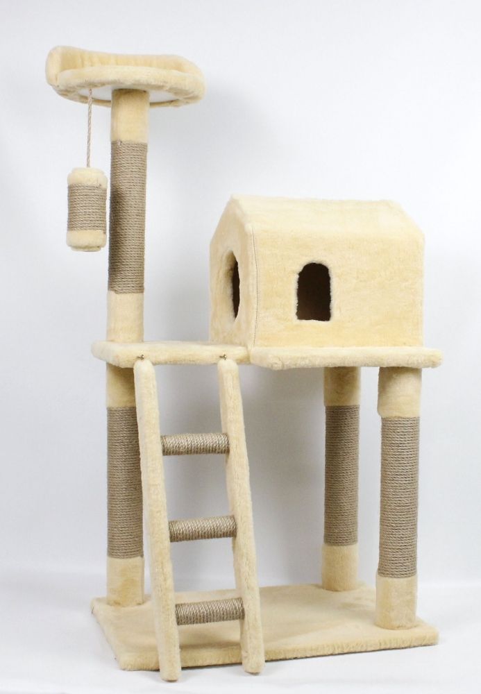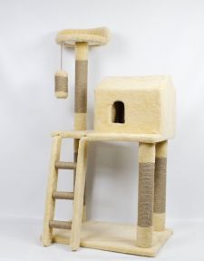 Будиночок + сходи-дряпка джут бежева висота 115см, довжина 60см, ширина 40см. Є 4 стовпчики дряпки висотою 50 см діаметром 7см. Драбинка 11187см, довжина самих перемичок (вони оброблені ДЖУТОВОЮ ниткою) 14см. Зверху є відкритий лежак розміром 30307см, з якого звисає іграшка 15см, діаметр її 7см. Також на середній платформі розташований будинок 303035 см, який має вхід 2020 см і віконце 108 см, будинок знаходиться на платформі, розміри якої біля входу 25302 см, біля віконця 34102 см.