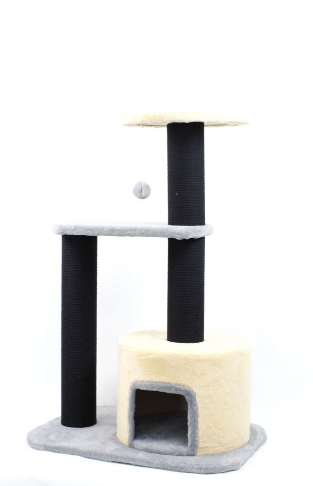 Мурзик Кігтіточка виготовлена зі штучного хутра та дерева, висота 102 см, довжина 70 см, ширина 50 см. Має три поверхи: на першому будиночок 3040 см, вхід 2020см, на другому розташована полиця 50252см, на третьому лежанка 40402см, всі поверхи між собою кріпляться за допомогою стовпчиків, обмотаних джутовою ниткою, 2 шт. діаметр 12 см, висота 30 см і 1 стовпчик 62 см. На драпці є мяка кулька (5 см), яка звисає на нитці 20 см.