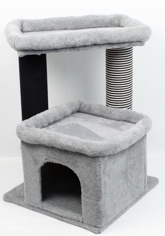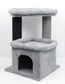 - Будиночок: знаходиться у нижній частині конструкції (розмір 363636 вхід 2222см), забезпечуючи захищене місце для сну та відпочинку кота.- Дві лежанки: одна розташована на середньому рівні над будинком (розмір 43435см), а інша на верхньому рівні (розмір 57376см), що дозволяє коті вибирати місце для відпочинку.- ганчірки: дві вертикальні стійки (висота 24см діаметр 12см), покриті матеріалом, придатним для точення кігтів (хб ниткою), що допоможе коту підтримувати пазурі в хорошому стані. -матеріал: штучне хутро, хб нитка, дерево.- Розміри: довжина 50см, висота 75см, ширина 50см.- Стабільність: конструкція стійка, щоб кіт не міг її перевернути під час гри.Така подряпа стане улюбленим місцем для вашого кота, забезпечуючи йому багато годин радості та комфорту.