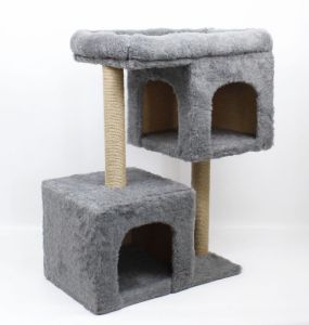 Висота 84см, ширина 40см, матеріал хутро, 2 стовпчики по 40см діаметр 7см з джутового намотування, розмір верхнього лежака 60408см, два квадратні будиночки 323535см, вхід 2522см.