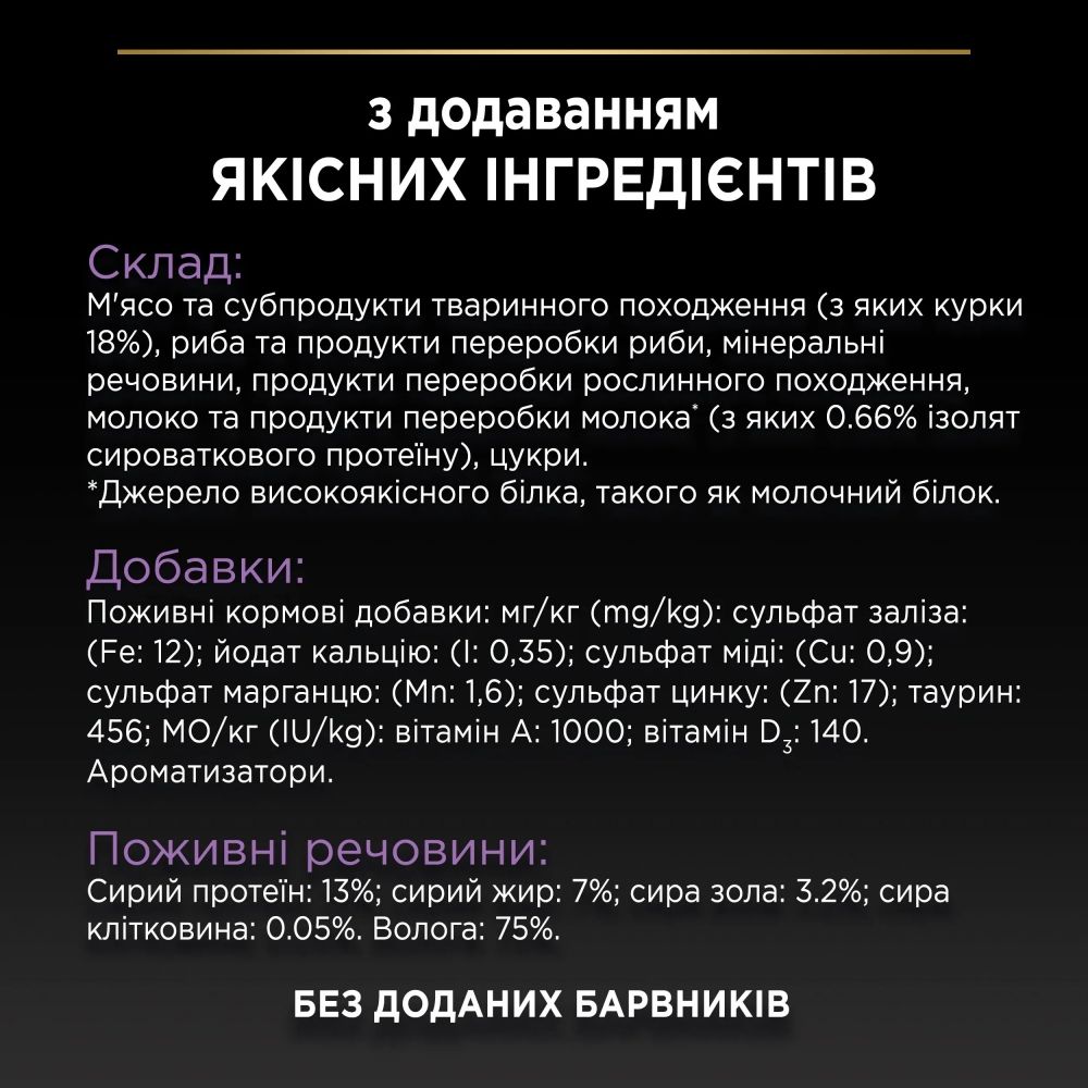 Purina Pro Plan Baby Kitten Healthy Start (Бейбі Кіттен Здоровий Старт).Консервований порційний повнораціонний корм для кошенят після відлучення від матері. Мус із куркою.Ніжний мус для кошенят з високим вмістом курки. Чудове рішення для першого прикорму, а також для харчування вагітних і лактуючих кішок. Перший прикорм - це запорука майбутнього здоровя Вашого малюка Саме тому ніжний мусPro Plan Baby Kitten Healthy Startз куркою містить збалансований комплекс поживних речовин, вітамінів і мінералів для активного і здорового життя кошенятиПеревагиКлас корму для кошенят Супер преміум.Джерело легкозасвоюваних молочних білків -лактоальбуміну і -лактоглобуліну.Джерело незамінних амінокислот з розгалуженими бічними ланцюгами (ВСАА) для здорового росту і розвитку мязів.Висока смакова привабливість.Підходить для вагітних і лактуючих кішок.Ніжна текстура для легкого переходу на раціони промислового виробництва.Виготовлено у ФранціїСклад:мясо та субпродукти тваринного походження (з яких курки 18), риба та продукти переробки риби, мінеральні речовини, продукти переробки рослинного походження, молоко та продукти переробки молока (з яких 0.66 ізолят сироваткового протеїну), цукри. Джерело високоякісного білка, такого як молочний білок.Поживні кормові добавки:Мгкг (mgkg):Сульфат заліза: (Fe: 12)Йодат кальцію: (I: 0.35)Сульфат міді: (Cu: 0.9)Сульфат марганцю: (Mn: 1.6)Сульфат цинку: (Zn: 17)Таурин: 456МОкг (IUkg):Вітамін А: 1000Вітамін D3: 140АроматизаториПоживні речовини:сирий протеїн: 13, сирий жир: 7, сира зола: 3.2, сира клітковина: 0.05. Волога: 75.Рекомендації щодо годівлі:При відлученні кошеня від матері вводьте корм у раціон кошеняти поступово. У віці 6 - 12 тижнів: 2 - 2.5 банки на день. Вагітним та лактуючим кішкам давати корм за потребою.Подавайте корм кімнатної температури. Свіжа, чиста питна вода повинна бути доступною тварині у будь-який час.Рекомендації щодо зберігання:Дату Вжити до кінця, реєстраційний номер фабрики та номер партії: див. на дні банки. Зберігати корм для кошенят у сухому прохолодному місці. Після відкриття банку закрити, зберігати корм у холодильнику, вжити протягом 24 годин.