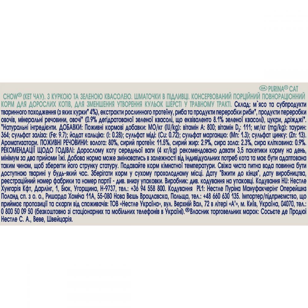 Cat Chow Hairball Control консерва для котів для виведення шерсті з куркою та зеленою квасолею, 85 г Акція